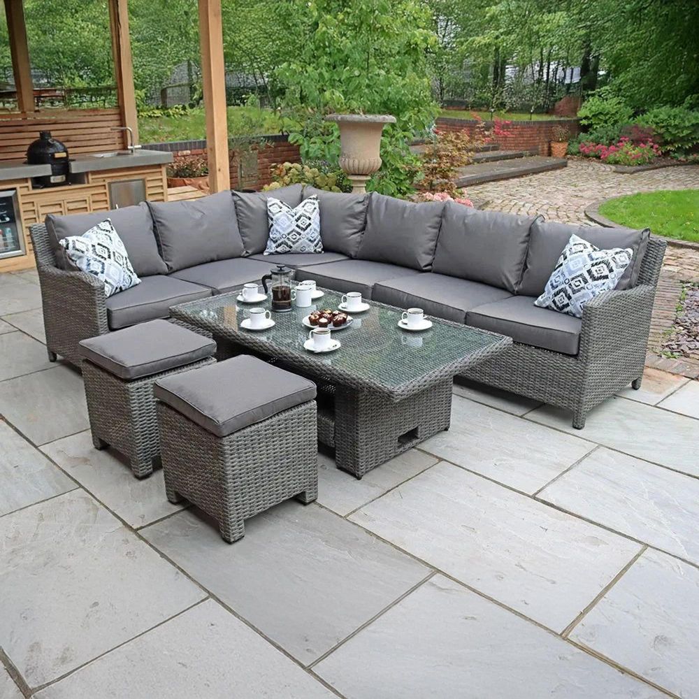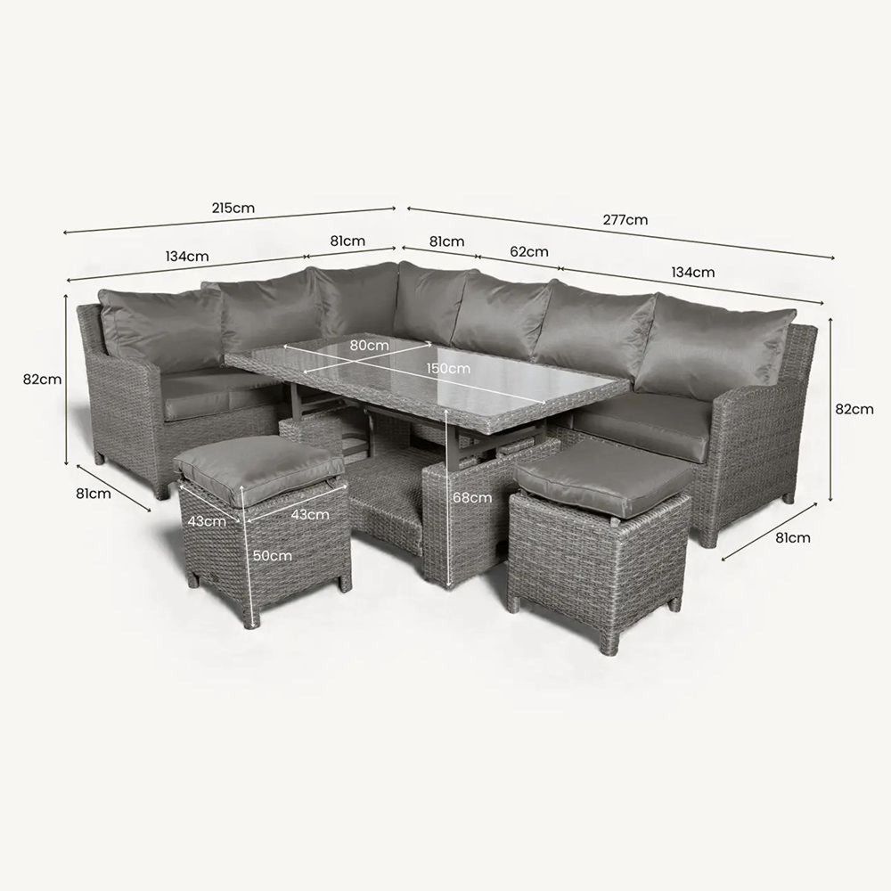 Paris Adjustable Corner Set The perfect blend of style and practicality for outdoor dining and relaxation. This elegant set features a classic design crafted from a sturdy aluminium framework and hand-woven synthetic double half-round rattan weave, ensuring both durability and aesthetic appeal.
