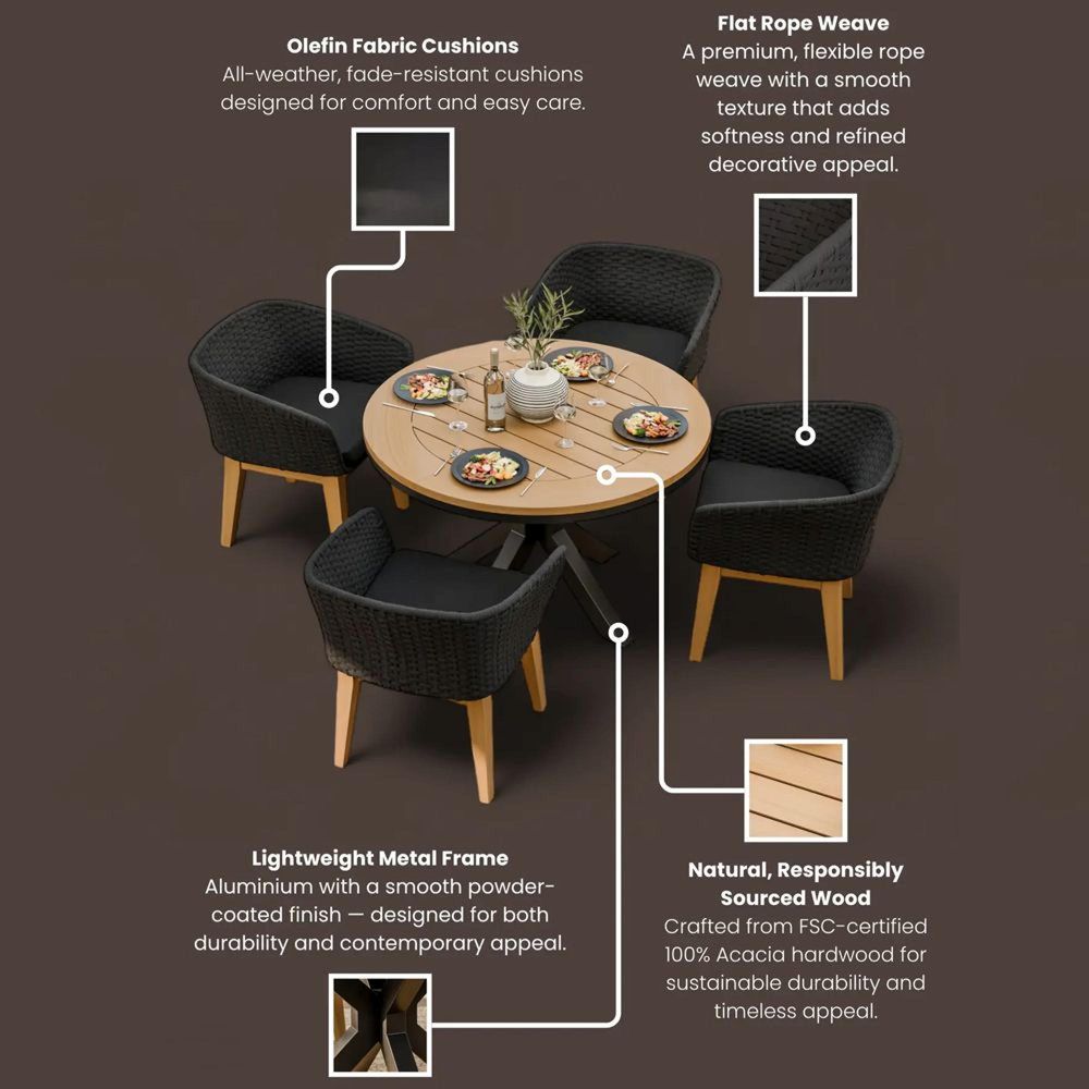 Rope Weave Chairs:The chairs feature a black rope weave, providing a stylish, modern look with added comfort and resilience.