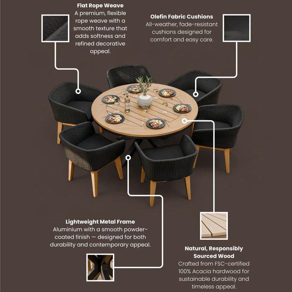 Rope Weave Chairs:The chairs feature a black rope weave, providing a stylish, modern look with added comfort and resilience.