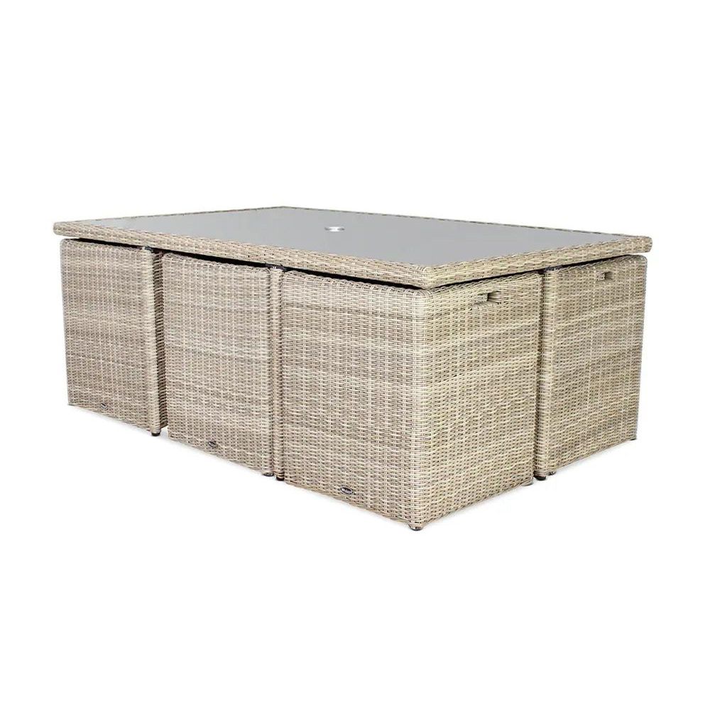 The Wentworth 10 Seater Cube Dining Set is a stylish and space-saving solution for outdoor dining, making it one of the most popular products for those who want to maximize their outdoor space. With a timeless design, it blends elegance with practicality. The aluminium framework construction ensures strength and durability, while the hand-woven synthetic half-round rattan weave gives it a classic, sophisticated look.