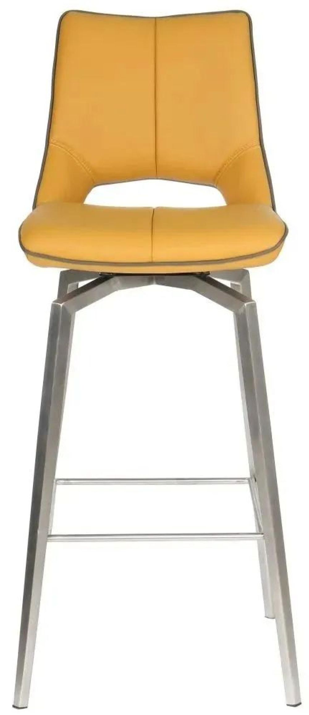 Item Code: 040-14-03-12-03 Note : 2 Men Next Day Delivery not available for Scotland (AB,DD,FK,IV,KW,KY,PA1-19,PH)The Medallion Yellow Leather Match Swivel Self Returning Mechanism Bar Chair offers an accomplished unique modern design with unmistakable style and presence. Built with a sturdy framework and featuring brushed stainless steel legs, this bar chair provides practical and comfortable seating. Assembly required. Sold individually. This stylish piece will very nicely complement the matching Dining Chair With Piping and Self Returning Mechanism Dining Chair, all available in 3 vibrant colours: Graphite Grey, Grass Green, Medallion Yellow.