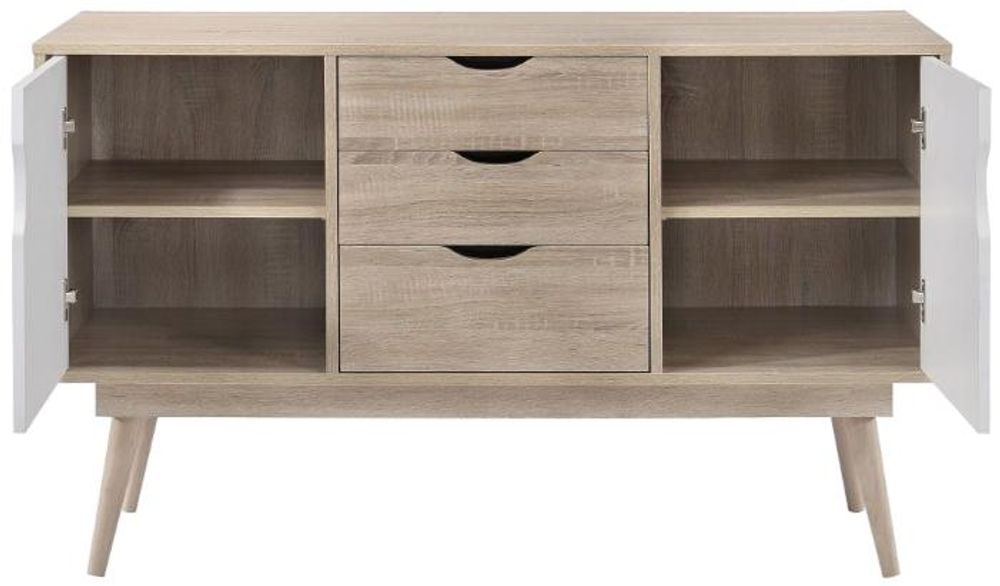 Our stylish Scandi-styled range has been designed for the modern home, adding an organised and clean feel for the living space.• Scandinavian Design Sideboard.• Complete with 2 Cupboards and 3 Drawers.• White and Sonoma Oak Fronts.