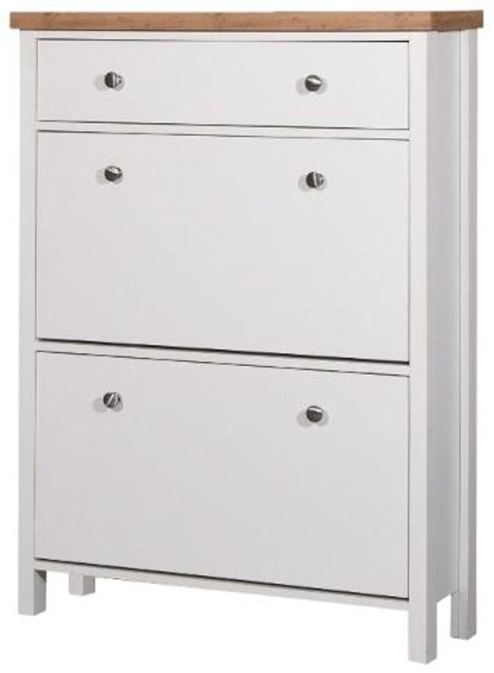 Bring elegance to your home, with a sense of British style and design with this bright collection. The Arthur series lends itself to solid wood looks with self-assembly simplicity.• White Frames with Contrasting Oak Top.• 2 Pull Down Drawers with Round Metal Knobs.• Metal Drawer Runners.