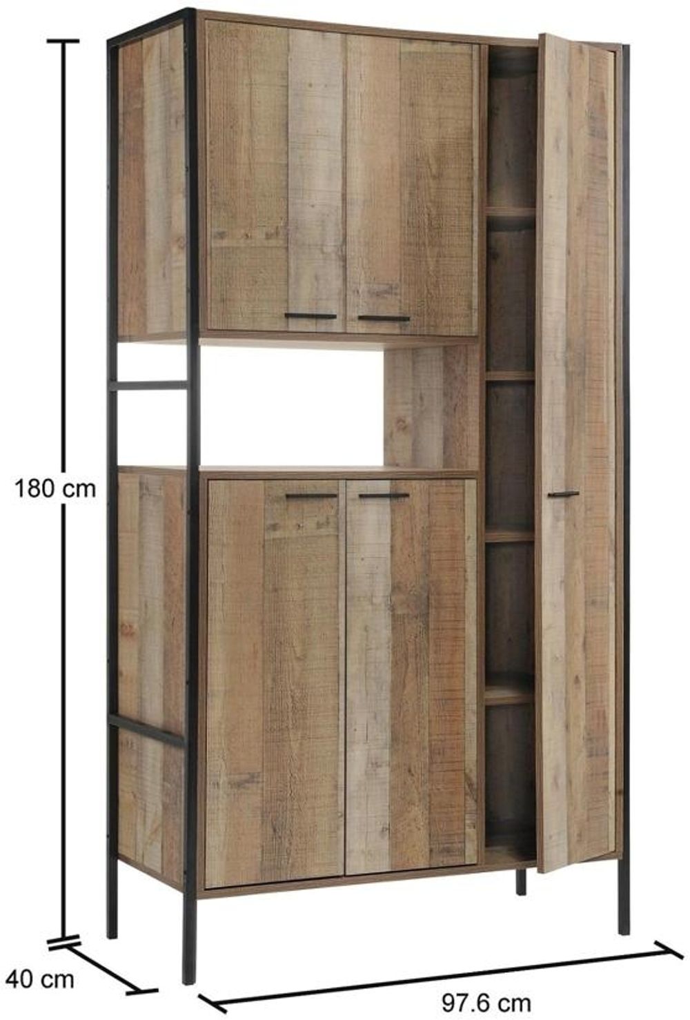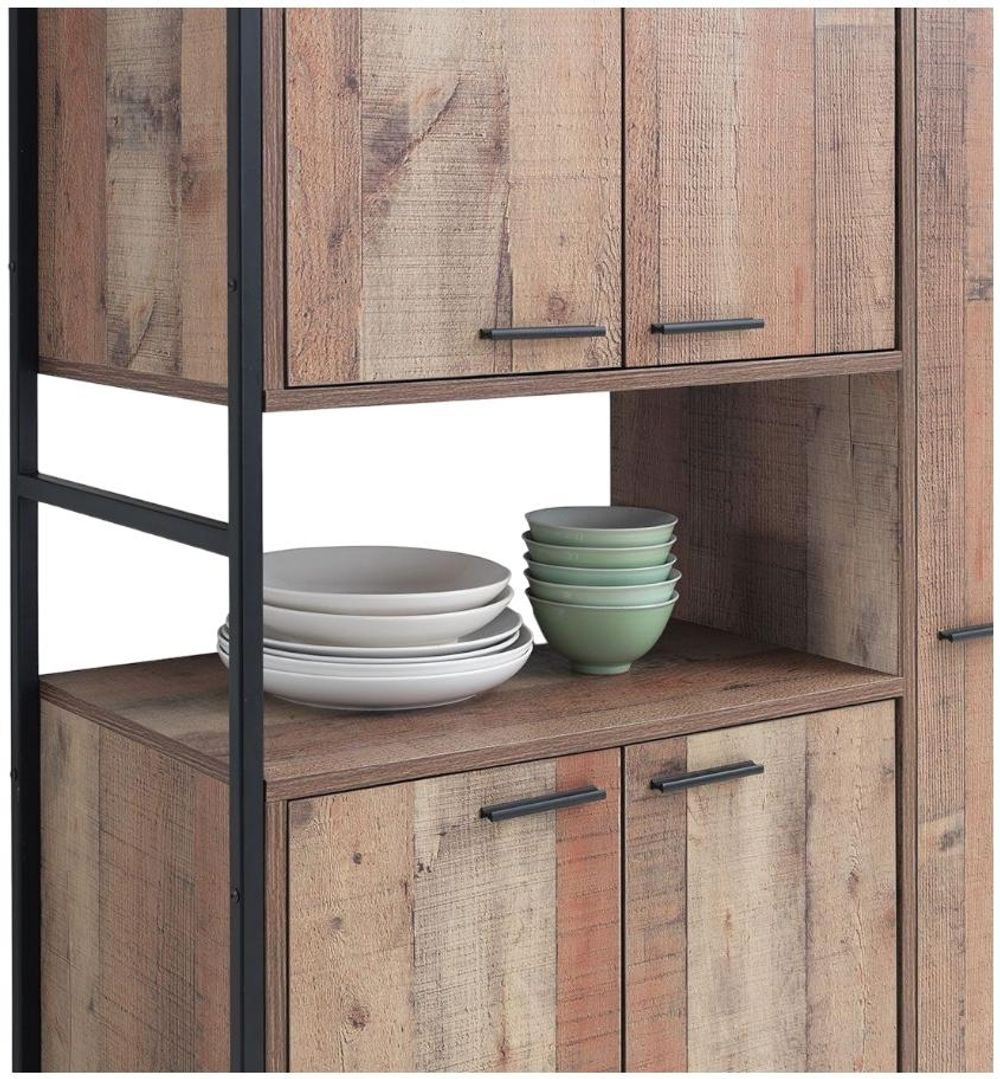 The ever-performing pioneers the Rustic Industrial furniture concept. Encased in a Matt Black metal frame, reclaimed wood effect planks have been designed with modern living at heart.• Rustic Medium Oak Effect Finish.• Suitable for Kitchen, Dining or Living Room.• Metal Hinges, Runners, Outer Frame and Legs.