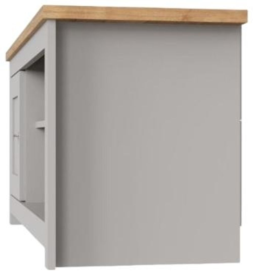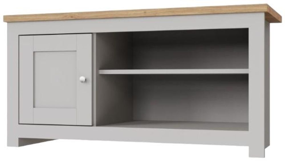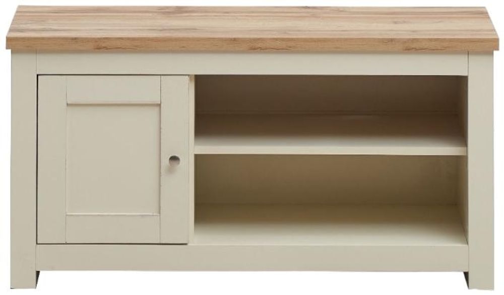 Full of presence, the Lyman range in Cream and cascading Oak tops fills any room with warmth and comfort. The Lyman TV unit features an open shelf that will hold all your media devices and a large cupboard.• Cream Frames with Contrasting Oak Effect Top.• 1 Cabinet and Open Shelf.• Elegant Steel Handles.