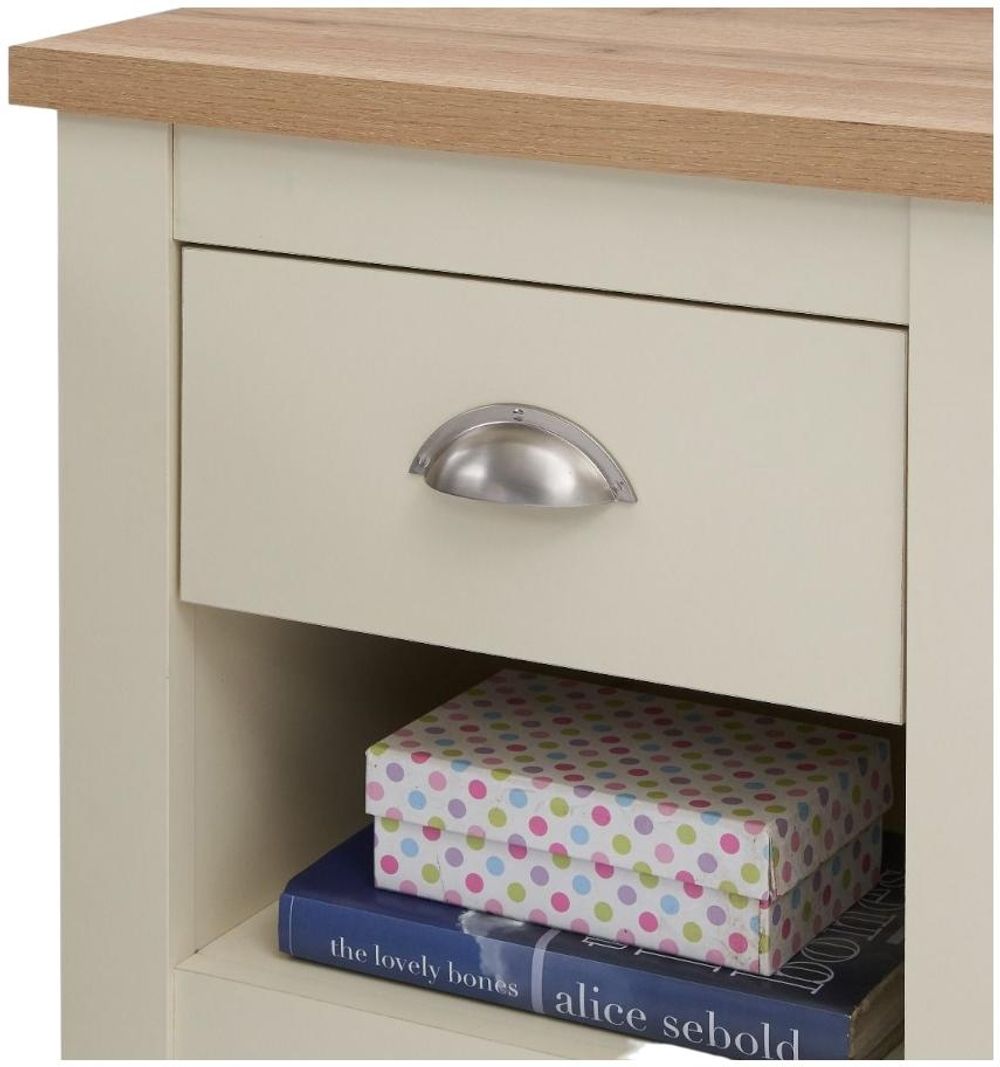Full of presence, the Lyman range in Cream and cascading Oak tops fills any room with warmth and comfort. This beautiful 1 drawer table is extremely versatile and can be used both as a bedside table in any bedroom as well as lamp table in the living room.• Cream Frames with Contrasting Oak Effect Top.• 1 Drawer.• Elegant Steel Handles and Metal Drawer Runners.