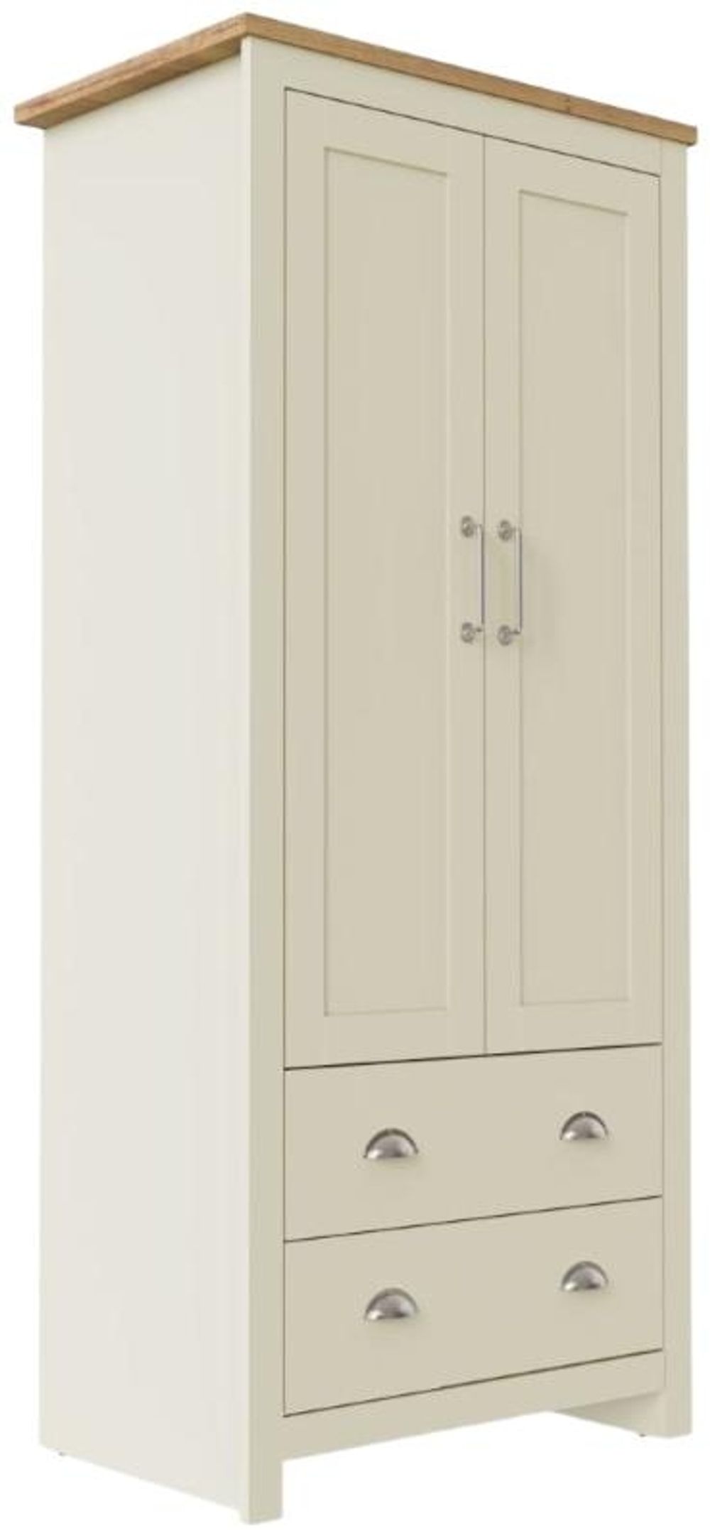 Full of presence, the Lyman range in Cream and cascading Oak tops fills any room with warmth and comfort. The Lyman wardrobe is completed with a hanging rail and 2 spacious drawers providing an effective storage mix.• Cream Frames with Contrasting Oak Effect Top.• Complete with Hanging Rail and 2 Spacious Drawers.• Elegant Steel Handles and Metal Drawer Runners.