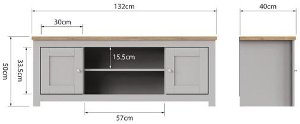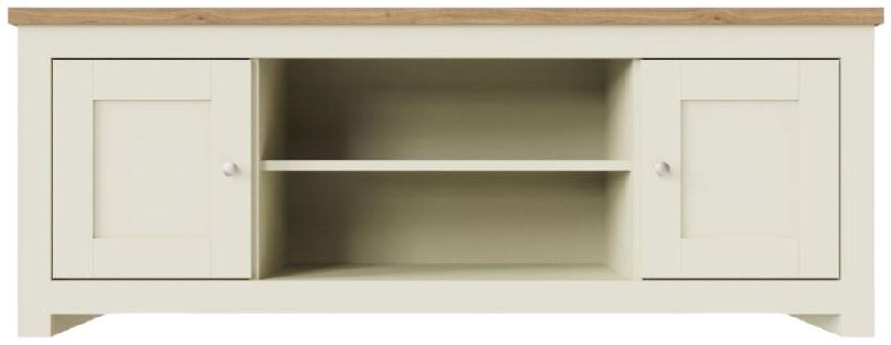Full of presence, the Lyman range in Cream and cascading Oak tops fills any room with warmth and comfort. The Lyman TV unit features an open shelf that will hold all your media devices and two large cupboards.• Cream Frames with Contrasting Oak Effect Top.• 2 Cabinets and Open Shelf.• Elegant Steel Handles.