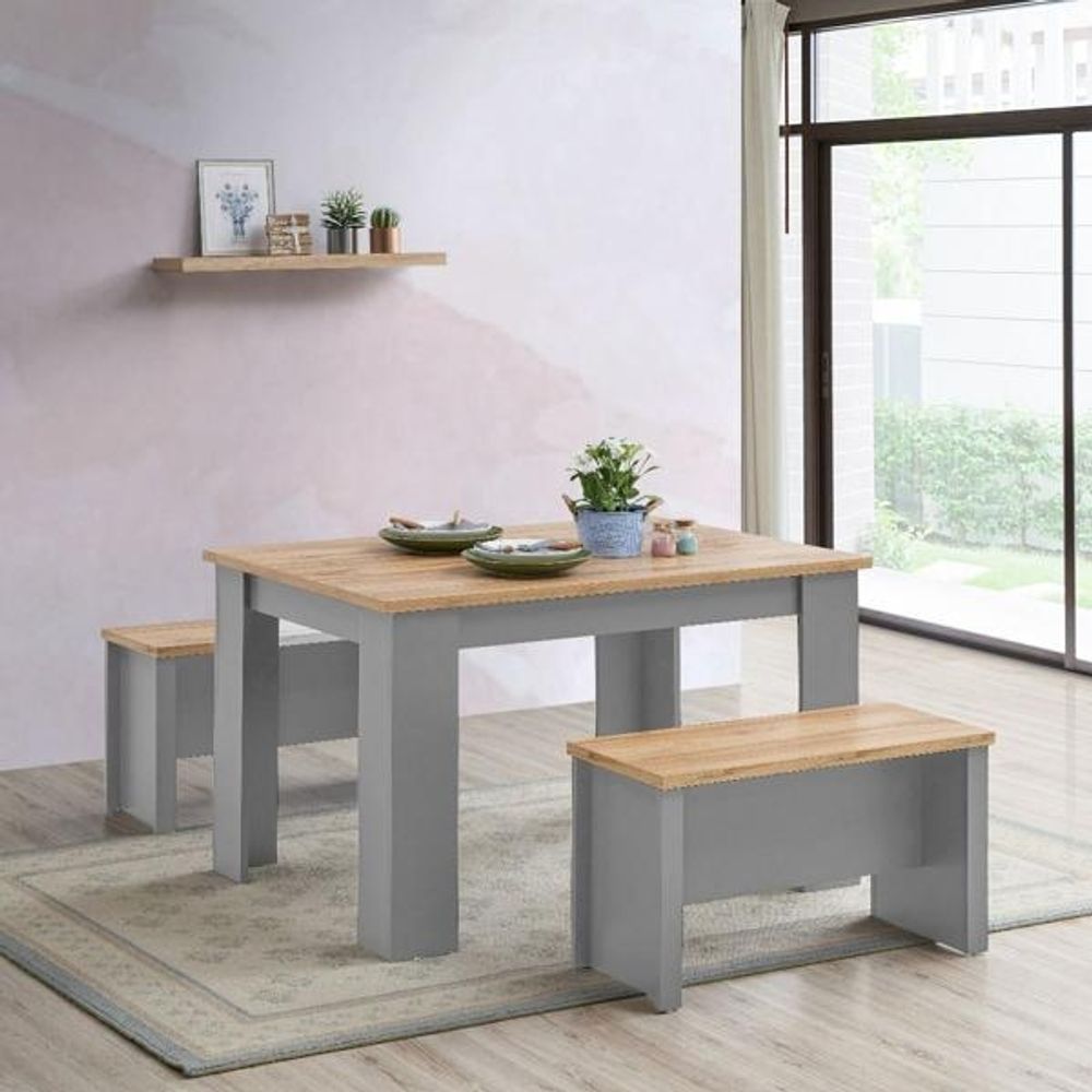 Full of presence, the Lyman range in Light Grey and cascading Oak tops fills any room with warmth and comfort. This minimalistic and contemporary dining set is perfectly suited for any kitchen or dining room.• Light Grey Frames with Contrasting Oak Top.• Each bench comfortably seats 2 people, perfect for enjoying laid-back meal.• Set includes: 2 Benches and 1 Dining Table.• Bench - Width 80cm x Height 46cm x Depth 35cm.• Table - Width 120cm x Height 75cm x Depth 90cm.