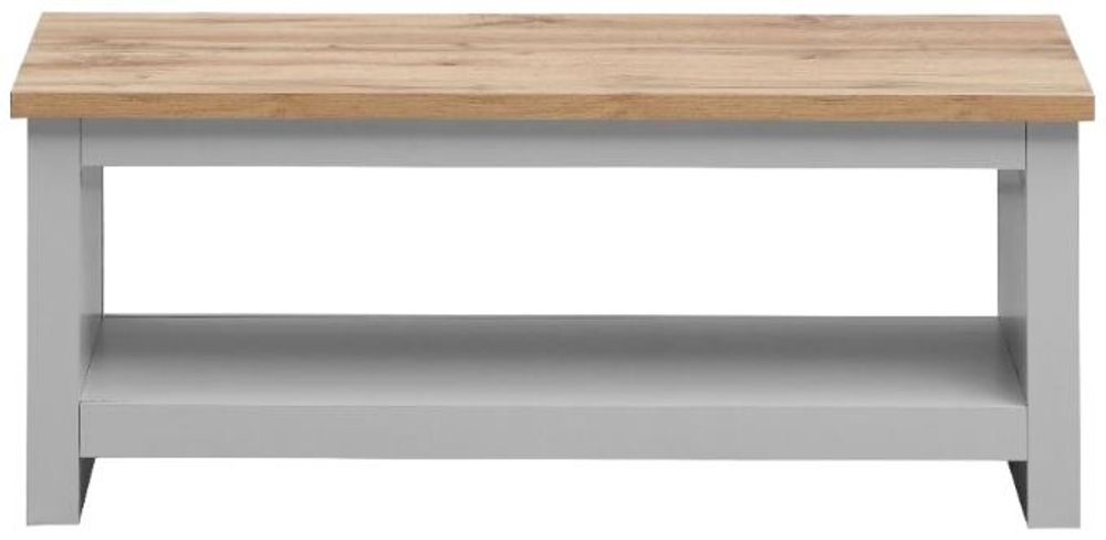 Lyman Grey Lift Up Coffee TableFull of presence, The Lyman Range in Grey and cascading Oak Tops, fills any room with warmth and comfort.This charming coffee table, with a lift up top and hidden storage, will add style to any living room.Complete with a lower shelf for additional storage, this coffee table will provide lots of storage for magazines, books or remotes.• Lift up top with hidden storage area• Grey with contrasting Oak effect top• 30mm chunky table top• Measures H42cm x W105cm x D52cm• Other matching items available Manufactured using Particle Board, each item comes flat packed for easy self assembly at home.Part of The Lyman Collection.Please note, due to lighting and different decives you may be using, the colour in the image may vary slightly from the actual colour of the product.