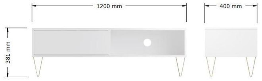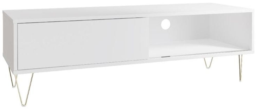 The Montour Range, both simple and stylish, fits perfectly into any room. A White finish with modern Gold legs, this collection offers a contemporary addition to your home.This TV Cabinet offers a sliding door with fantastic storage space along with an eye-catching slickness. Featuring a sliding door, with simplistic, yet stunning Gold legs. The Montour TV Cabinet offers great functionality that looks good with any modern décor. • Open storage with sliding door• Measures H38.5cm x W120cm x D40cm• Other matching items availablePart of the Montour Range.Manufactured using particle board, each item comes flat packed for self-assembly at home.Please note that due to lighting and different devices you might be using, the colour in the image may vary slightly for the actual colour of the product.