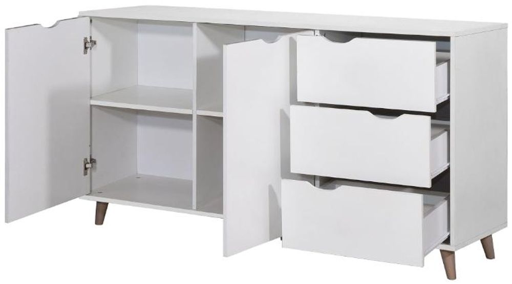 All White, all bright, and guaranteed to bring light. The Perce has undergone a re-design which allows versatility. Popular with contract furniture suppliers, the Perce is a must.• Scandinavian Style Sideboard.• White Finish with Wooden Legs.• 2 Large Cupboards with Internal Shelves and 3 Generous Drawers.