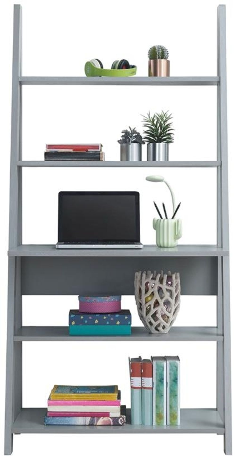 Sleek, contemporary design for the modern living space, and available in a range of primary colours, the Ross range offers an open feel to shelving and storage.• Contemporary Design Ladder Desk.• Overhanging Shelf Doubles as as Desk.• 5 Tiered Shelving Unit.
