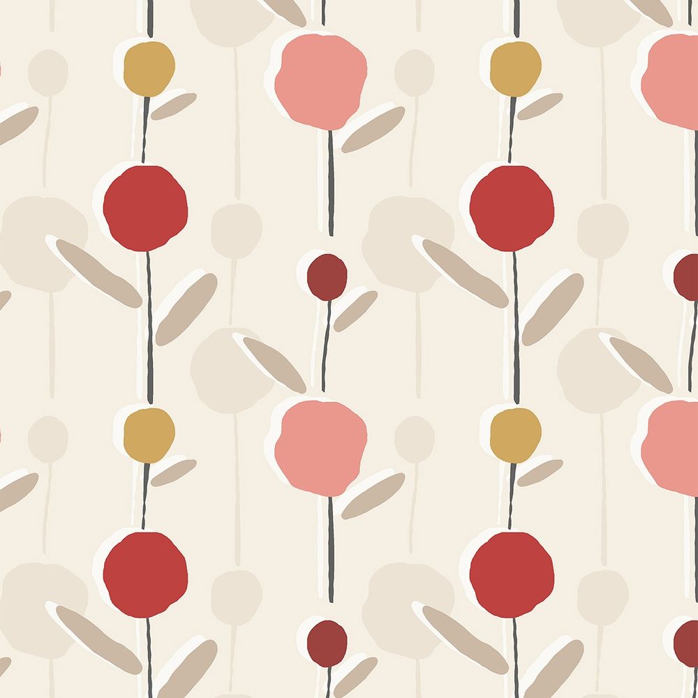 A printed simple linear floral motif with shades of cherry, mustard and natural.