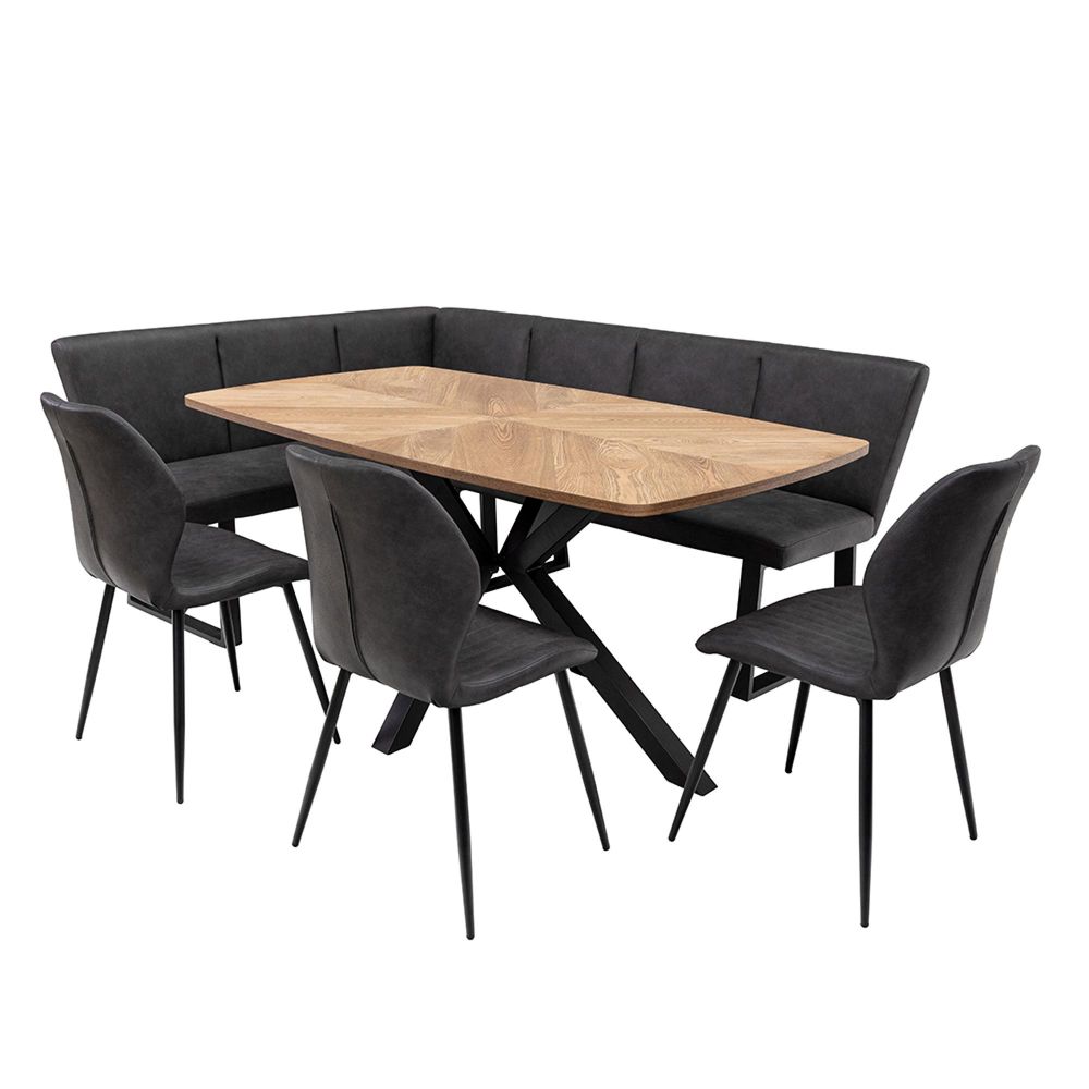 Item Code: HAM01 The Hampton oak veneer dining table features a beautiful hand designed symmetrical inlay, with a warm medium oak finish that adds character to the overall look.Constructed using a combination of oak and elm veneers, the top sits on an x frame style black powder coated base.Simple design using detailed craftsmanship.