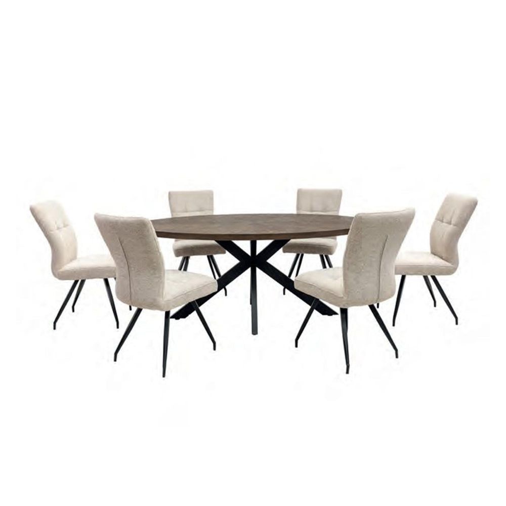 Item Code: SAM01 The Samara dining table features a striking sunburst design, which has been meticulously hand crafted and finished in a dark oak stain. This wonderful visual presentation is completed using an x-frame leg base in a black powder coated finish.