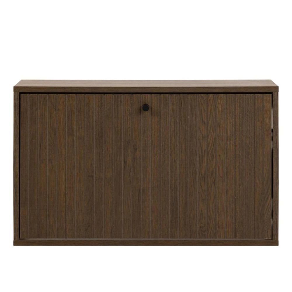 Item Code: 105863 Albany shoe cabinet, frame and drawer smoked oak rough melamine with wall mounting.dorned in a smoked oak look with a lamella front, this shoe cabinet adds style and practicality to your hallway. Playing with contrast, the smoked oak look complemented by black accents creates a well-balanced visual appeal. Hang it on the wall to utilize your space and keep your shoes stored out of sight. FSC certified.Free Delivery