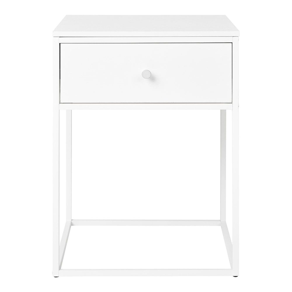 Built with a strong white metal frame and a smooth, high-quality MDF top, this side table is made to last. It includes a spacious drawer fitted with a matching white knob, providing a discreet place to keep remote controls, chargers, accessories, and other everyday essentials. Beneath the drawer, an open shelf gives additional display or storage space, keeping items easy to reach without creating clutter.