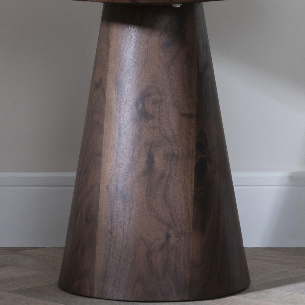 The round wooden top offers a smooth surface ideal for everyday use whether it's holding a cup of coffee, a decorative lamp, or evening drinks. Supported by a sturdy cone shaped pedestal base, the table stands firm while adding a contemporary architectural element to your living space.