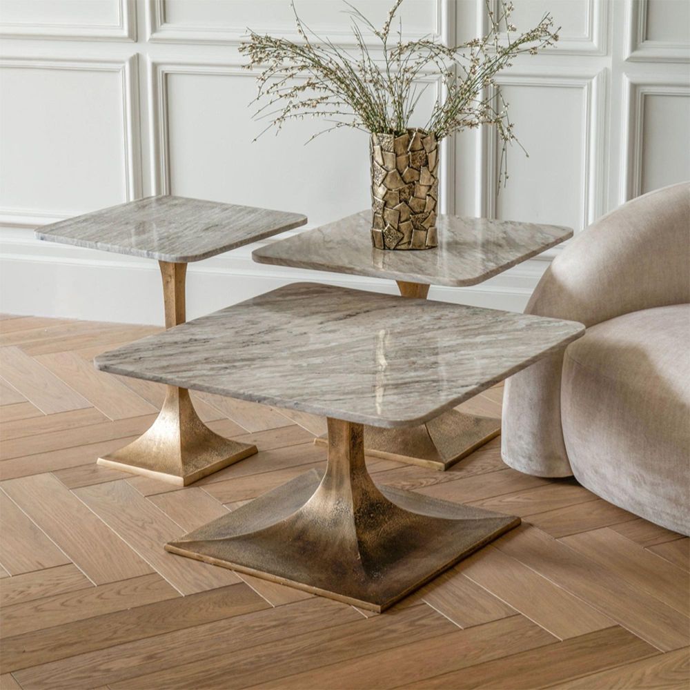Item Code: 706249 The Square Morchino Side Table showcases the stunning elegance of Morchino marble, known for its striking blend of grey and white tones, with subtle veining that creates a sophisticated finish. The natural marble makes every piece unique, and the top rests on a sleek aluminium base finished in antique brass. The Hinton collection is available in side tables in 44 cm and 55 cm sizes, as well as a 70 cm square coffee table. This is natural marble, quarried from mountains in Rajasthan, India. As an organic material, it is prone to variations in colour, pattern and density, all of which are hallmarks of its beauty and charm. Marble is formed from the recrystallization of limestone under intense pressure and high temperatures within the earth over thousands of years. During this process, the minerals introduced into the structure produce the beautiful colours and veining which characterize natural marble and differentiate it from synthetic substitutes. These variations are the essence of one of the world's most beautiful organic materials.