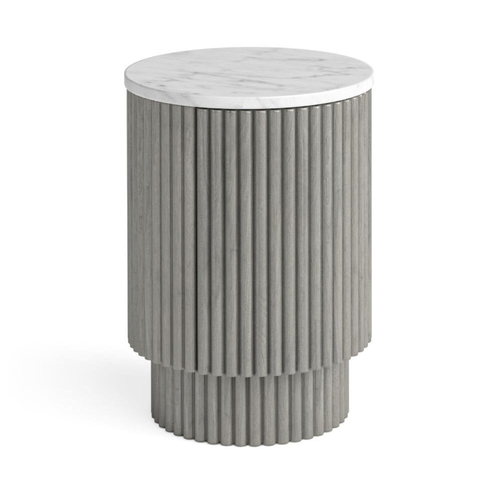 Isabella Grey Side Table - 1 Door Fluted Round - White Marble Top