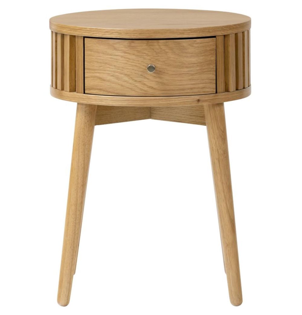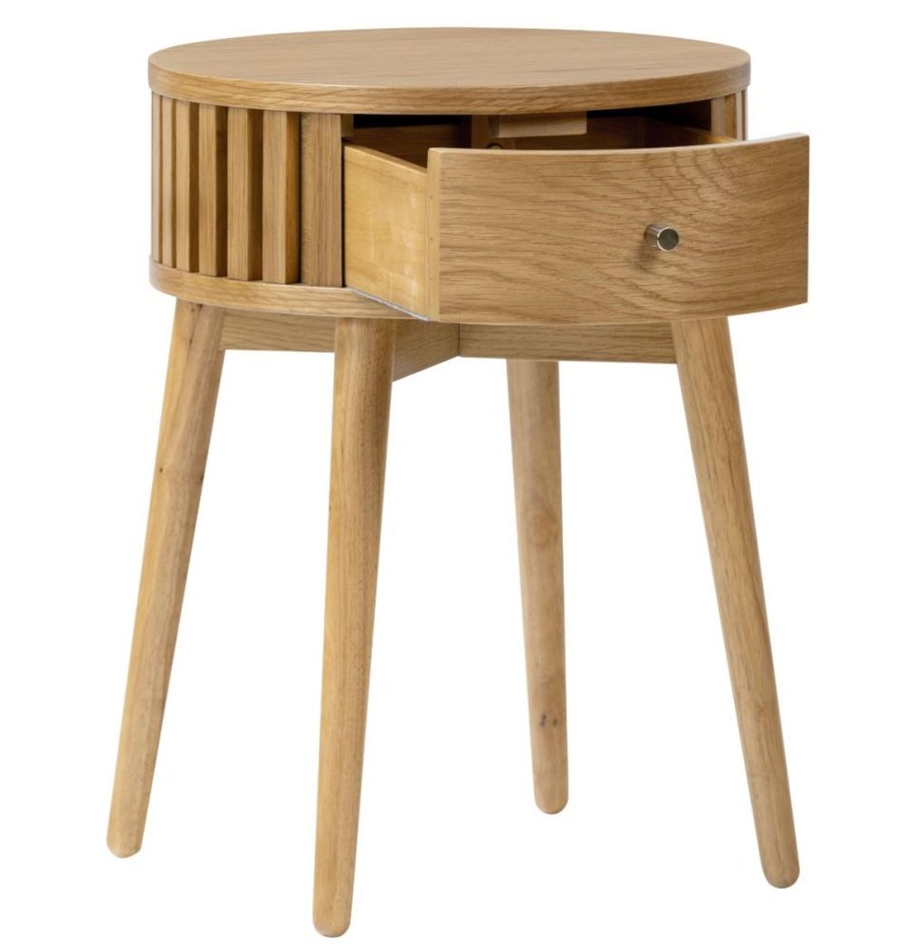 Compact yet practical, this side table features one spacious drawer for storing essentials like remotes, magazines, or small accessories, while the smooth round tabletop provides a perfect surface for lamps, décor, or drinks. Its natural oak finish and minimalist design make it a versatile piece suitable for modern, Scandi, or classic interiors.
