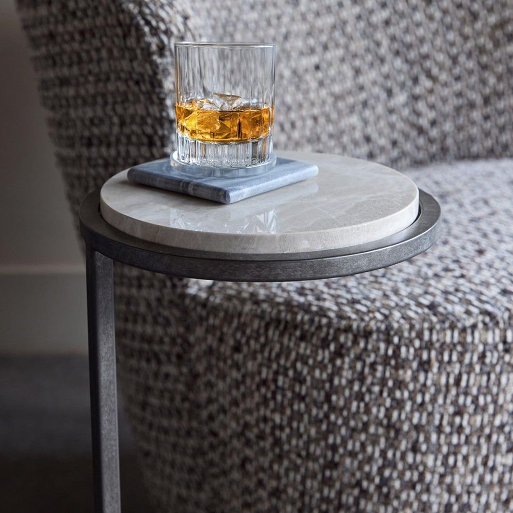 Item Code: 706578 A stylish continuation of our popular Iota range, this round accent table is defined by bold materiality and refined form. Its compact top in cool-toned Italian Grey Emperador marble is elevated by an aged silver iron frame, offering subtle elegance. A sculptural base detail adds a retro touch, perfect for layered, contemporary interiors.26 x 26 x 59cm.The Iota collection also features a wide selection of finishes including Black Marble, Brown Emperador, Forest Brown, White Banswara, Green Onyx, and two elegant oval styles.Free Delivery
