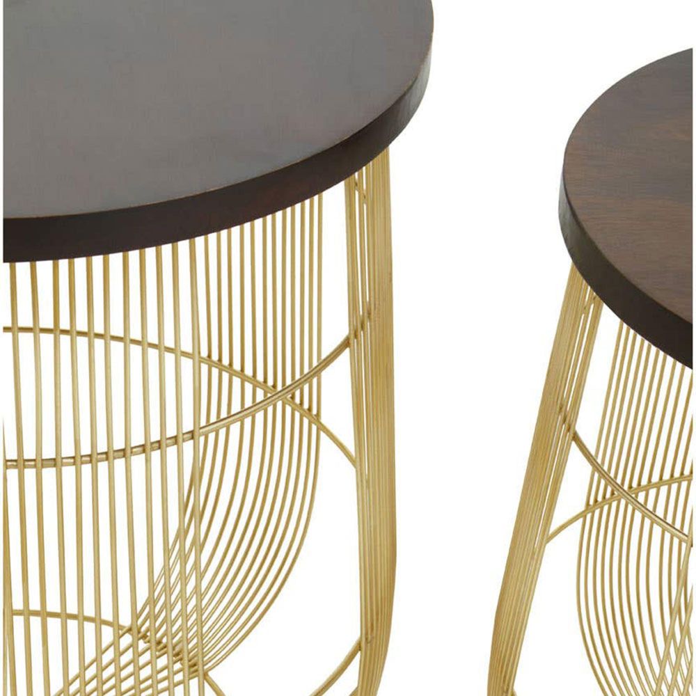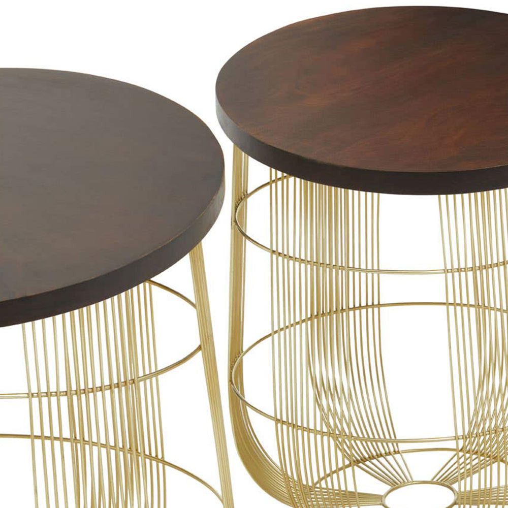 Item Code: 5502727 The warm metallic finish counterpoints the dark-toned wooden tops of this side table to create a visual interest in any space.Designed with elegance in mind, each of these side tables is topped with a round piece of e mango wood that has a smooth, walnut finish. The minimalistic design recalls the glamour of art deco, with repeated lines being intersected by metallic rings.Free DeliveryDelivery & Service Highlights: