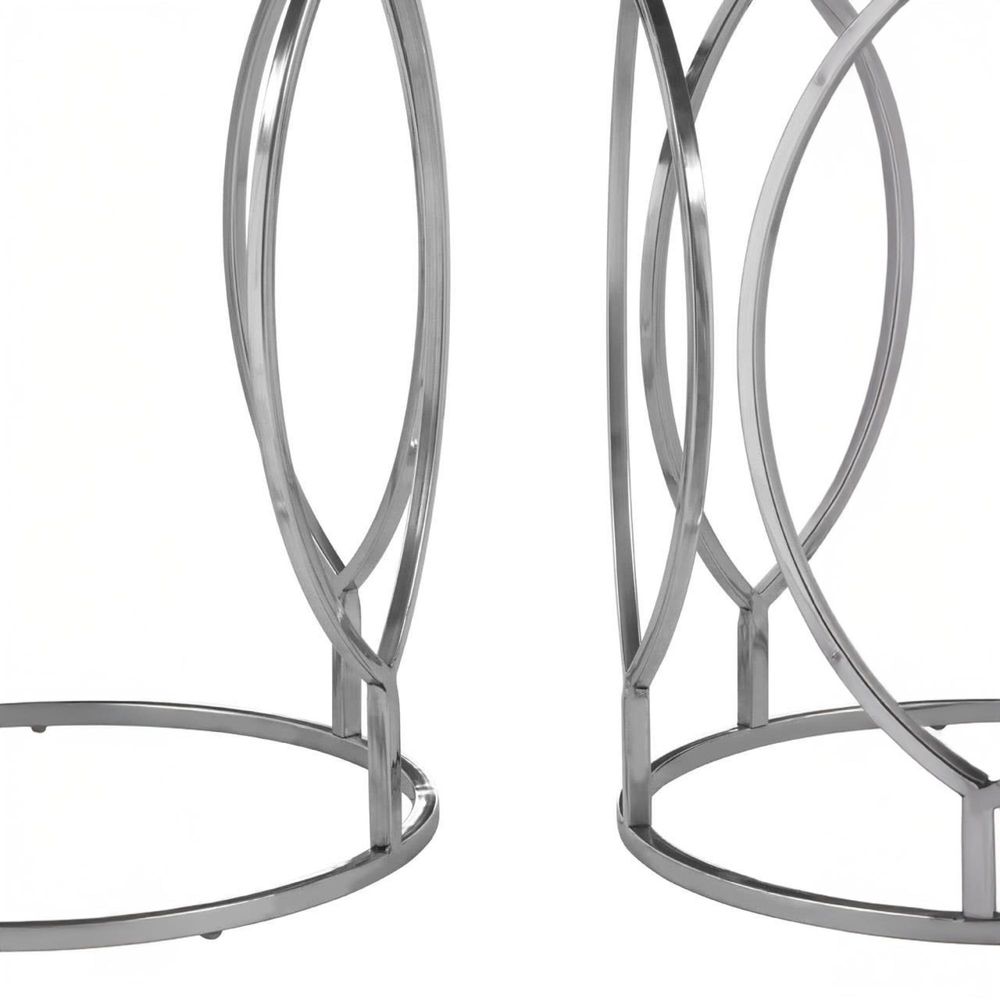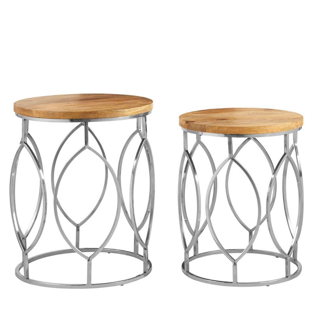 Item Code: 5502721 The set of these coordinating side tables feature minimal, open designs and employ a metallic silver finish.They are topped by mango wood which has prominent graining that adds tactility. The striking contrast of the natural light-toned wood and the reflective silver tones make these boho accent pieces visually intriguing.Free DeliveryDelivery & Service Highlights: