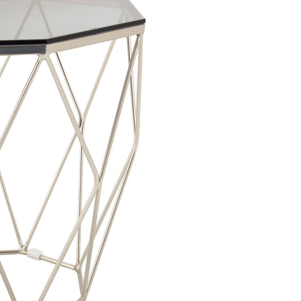 Item Code: 5501361 The Allure nickel finish end table features a smoke grey octagonal tempered glass top.The Allure end table uses slim strips of metal to create a striking geometric base. The diamond shaped patterns are accentuated by the metal's brushed nickel finish. A slim band of metal separates the base from the smoke grey tempered glass tabletop.