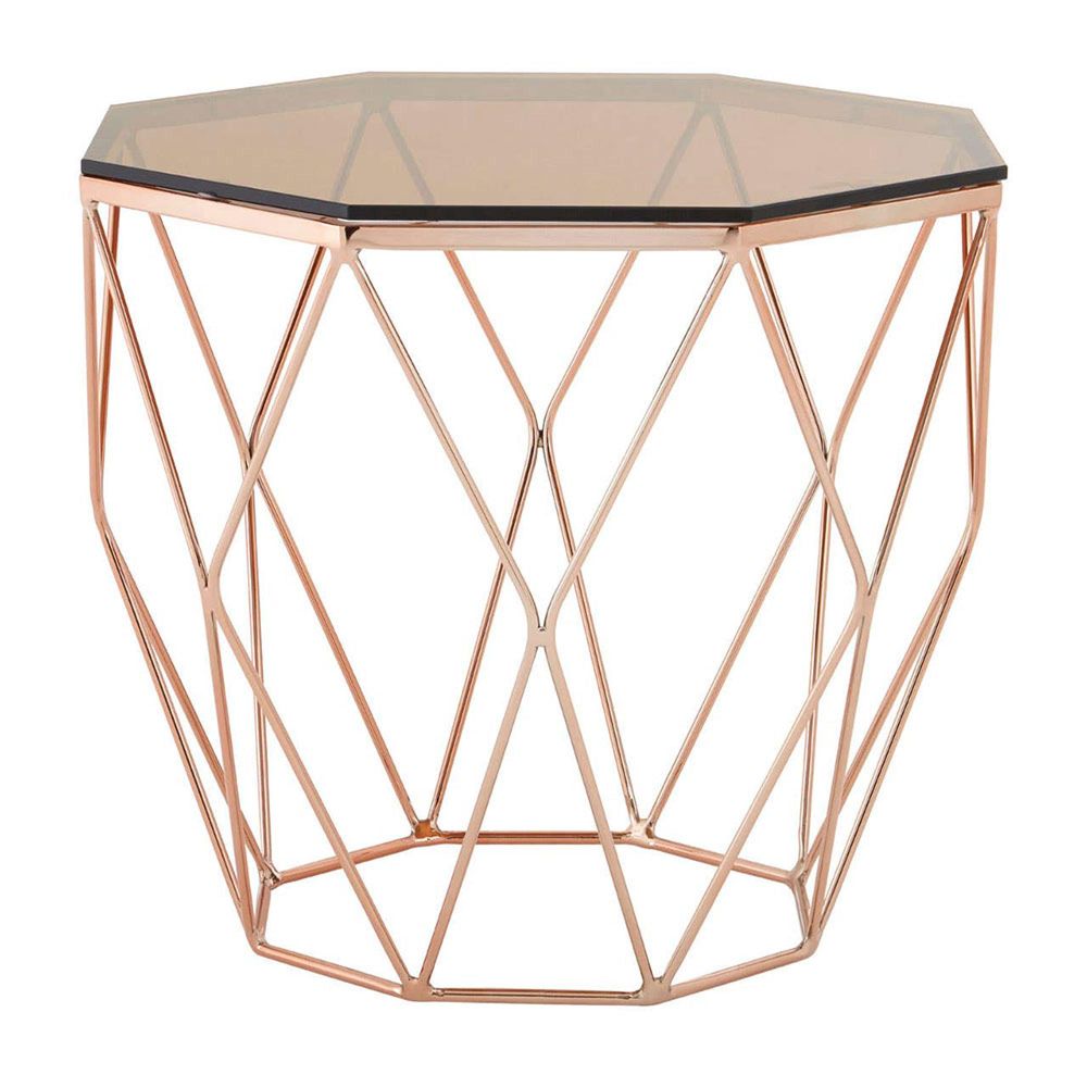 Item Code: 5501362 Allure rose gold end table with amber smoked tempered glass topThe Allure end table uses slim strips of metal to create a striking geometric base. The diamond shaped patterns are accentuated by the metal's rose gold finish. A slim band of metal separates the base from the amber smoked tempered glass tabletop its hexagonal shape adding to the table's polygonal appeal.