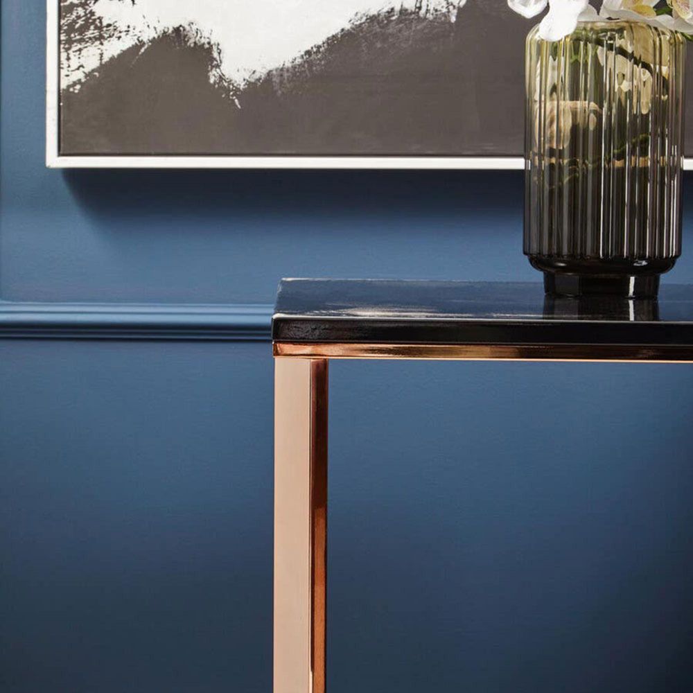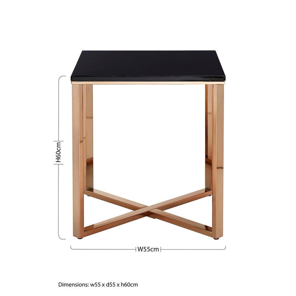Item Code: 5501384 Incorporate this sleek end table into a luxurious Boutique design setting.The Allure end table successfully combines black with warm-toned metal to create a refined and contemporary accent piece. Its square tabletop is formed from faux marble the black colouring lightened by wisps of silver.