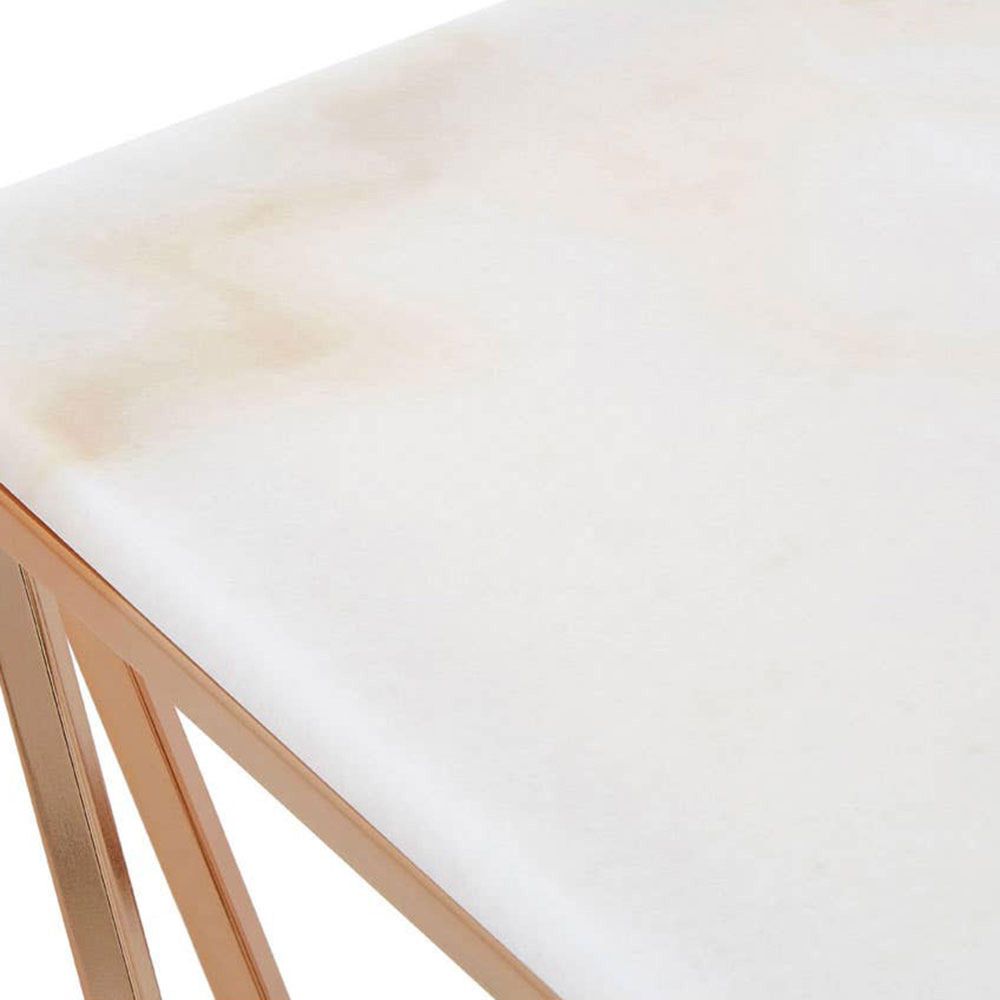 Item Code: 5501451 Prismatic and polished the Allure champagne end table's metal legs create a geometric look.The geometric Allure end table stands on a square base supporting straight lines that angle upwards to create triangular shapes. This design allows the square marble tabletop to be positioned at an alternative angle to the base giving the table its playful optical appeal. The marble's crisp white colour complements the rose gold metal legs.