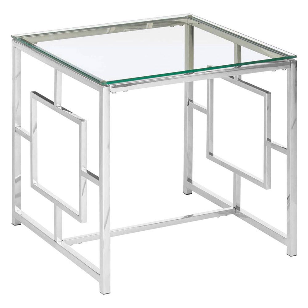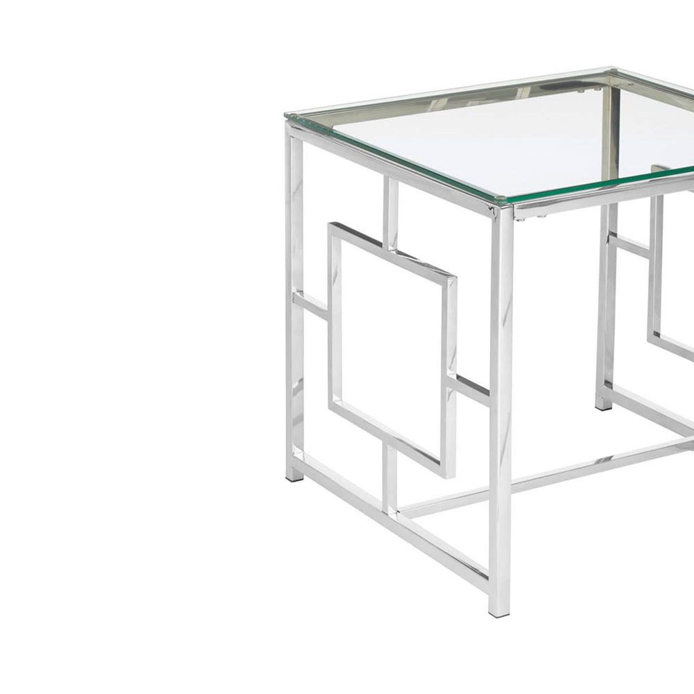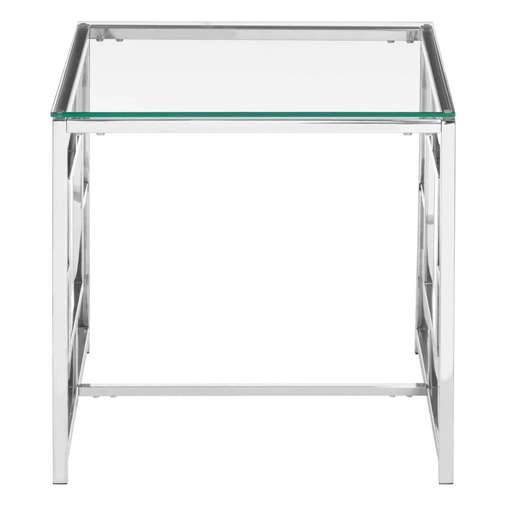 Item Code: 5502542 The clean and simple design lines give this sleek clear glass end table a contemporary and minimalistic look.The frame is made from stainless steel and has a reflective chrome finish with sides that boast a rectangular inset feature. The top is made from tempered glass and has a crystal clear colour. It looks great styled with metallic accessories.