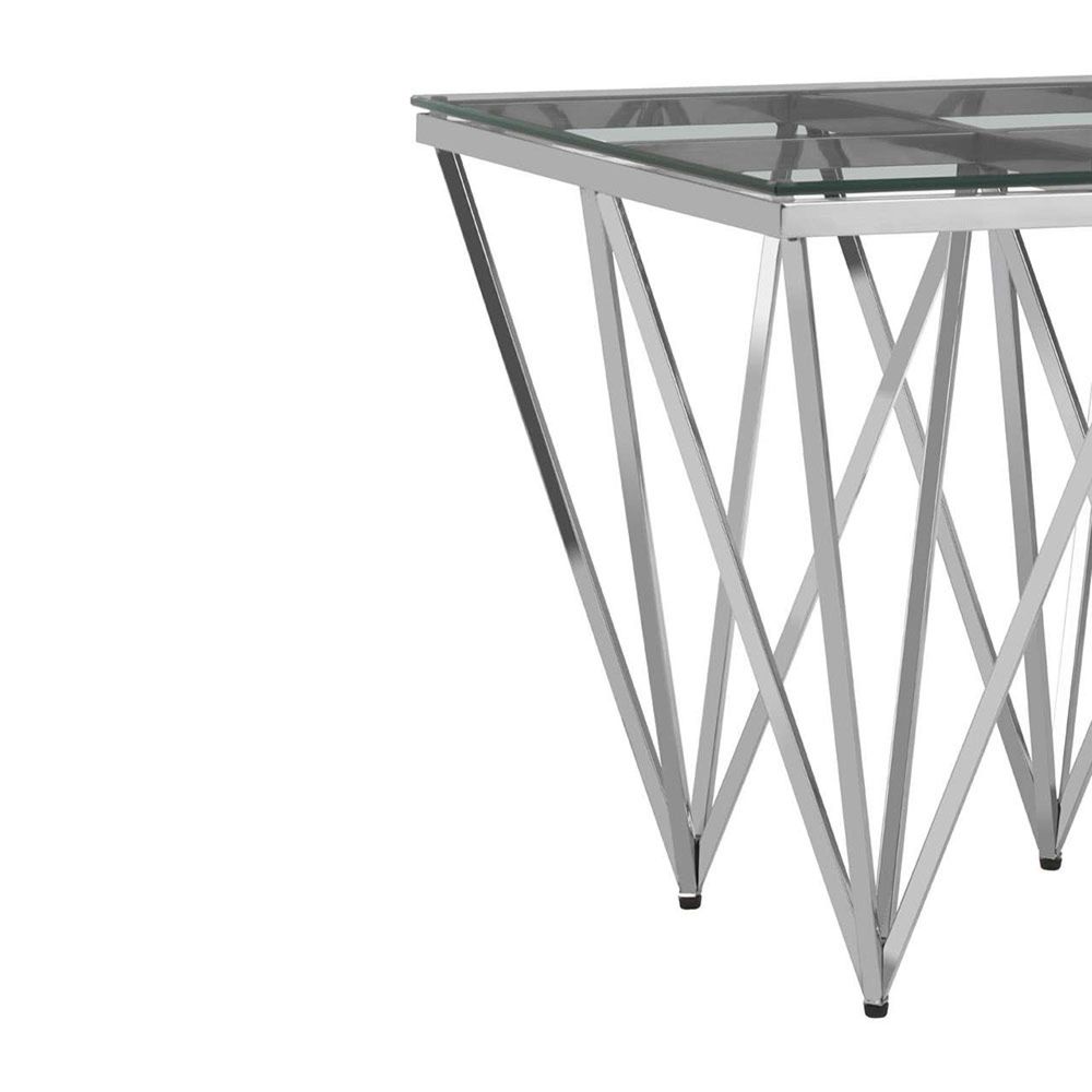 Item Code: 5502556 Allure silver finish stainless steel end table with tempered glass top adding a hint of luxe style to the living room.Its slim pincer-like legs are formed from tough stainless steel and boast a sleek silver finish. Their triangular formation counterpoint the square top the latter finished with tempered glass.
