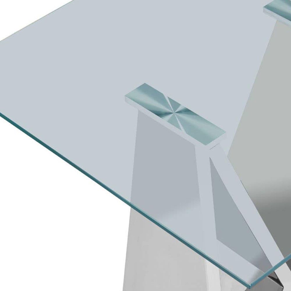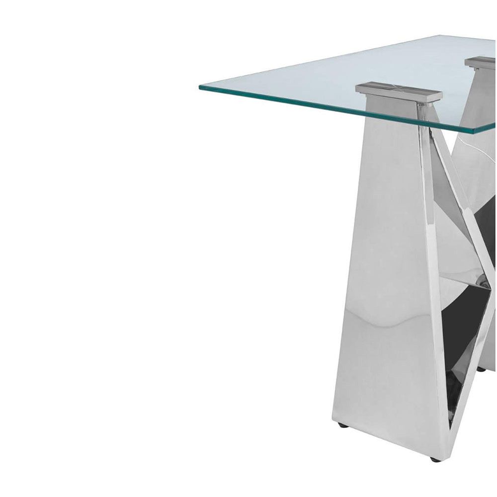 Item Code: 5502580 The Allure end table features a wing base design. The reflective stainless steel base complements a clear tempered glass top.A pair of triangles made from sleek stainless steel are arranged at an angle beneath the clear tempered glass top. The steel has a reflective finish that complements the glass. Part of the Allure collection it's a great way to introduce a highly reflective accent piece to the living room.