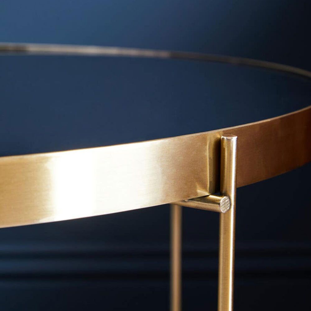 Item Code: 5501436 The Allure large side table has brushed bronze metal legs and black finish glass top creating a boutique design.A round pane of mirrored glass is set into a band of metal. The metal has a brushed bronze finish that complements the black glass. A simple metal lattice supports the tabletop attached to which are four slim legs that give the table a lean aesthetic. Another lattice is formed at the base to create angled lines that counterpoint the round tabletop.