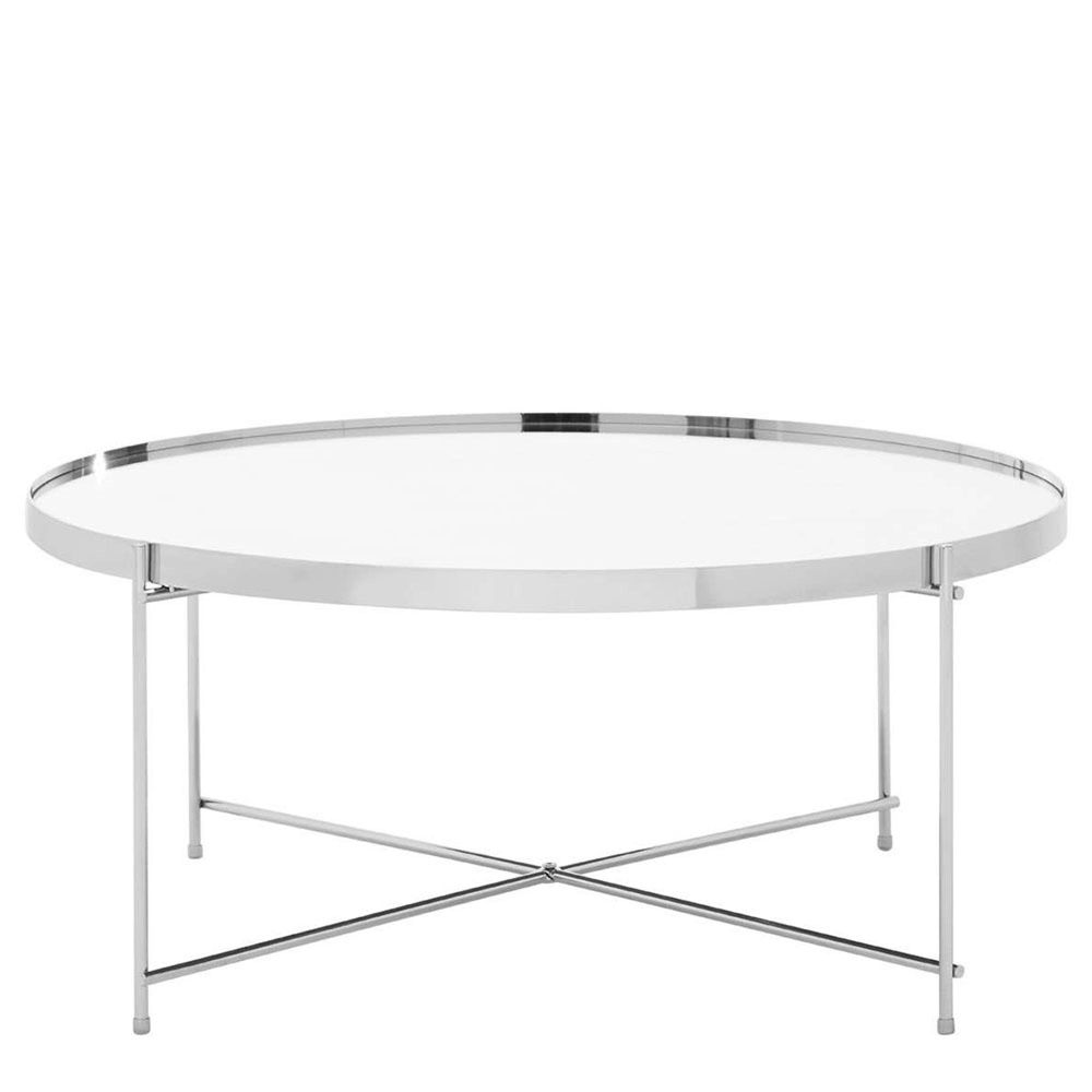 Item Code: 5501437 The Allure coffee table has chromed metal legs and silver finish glass top creating a boutique design.The tabletop is formed from a single piece of mirrored glass with a silver finish which complements the polished chrome. The reflective tabletop sits within a large circular band of metal supported by a crossed formation. Its thin tubular legs contribute to its poised look with another cross at the base.