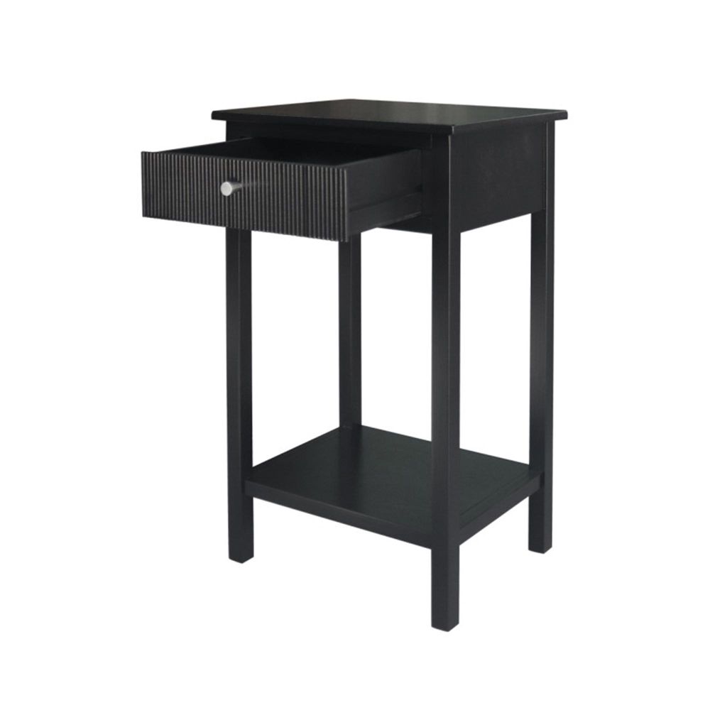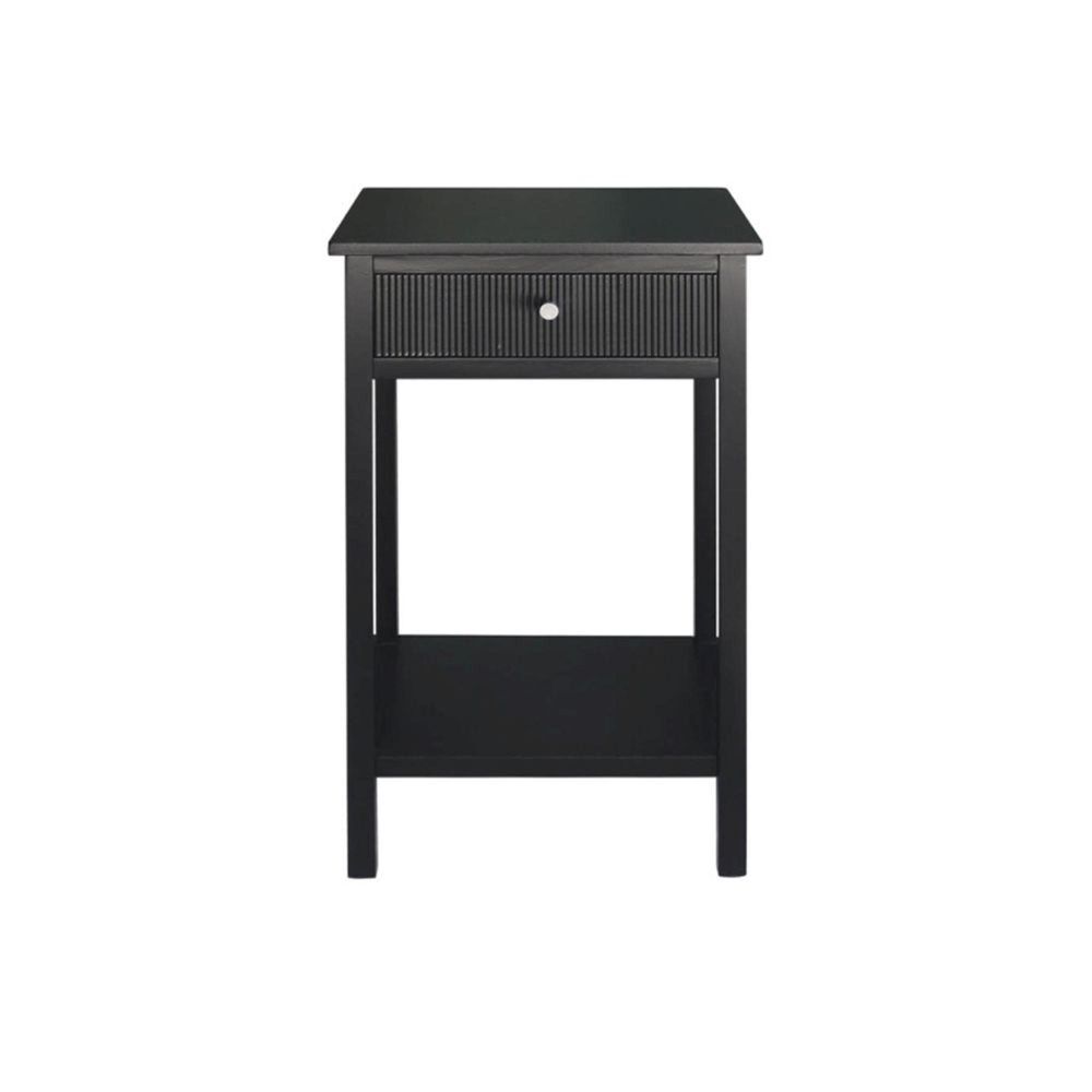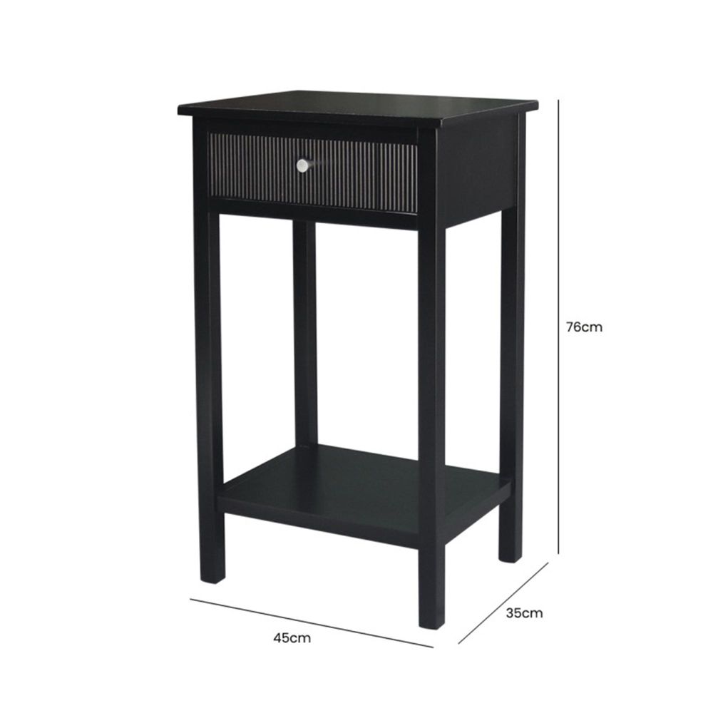 Item Code: WF294-00-BL The Lindon 1 drawer end table in the black wood finish is an elegant addition to any living area. The ample drawer front?s grooved design is further enhanced by a choice of either nickel or gold effect knob handles. The fixed bottom shelf and tabletop provide additional storage and display making this piece both practical and undeniably stylish. This piece is also perfect as a bedside, side, display, or occasional table.NOTE: The product comes with two colour handles, silver and gold.Free Delivery