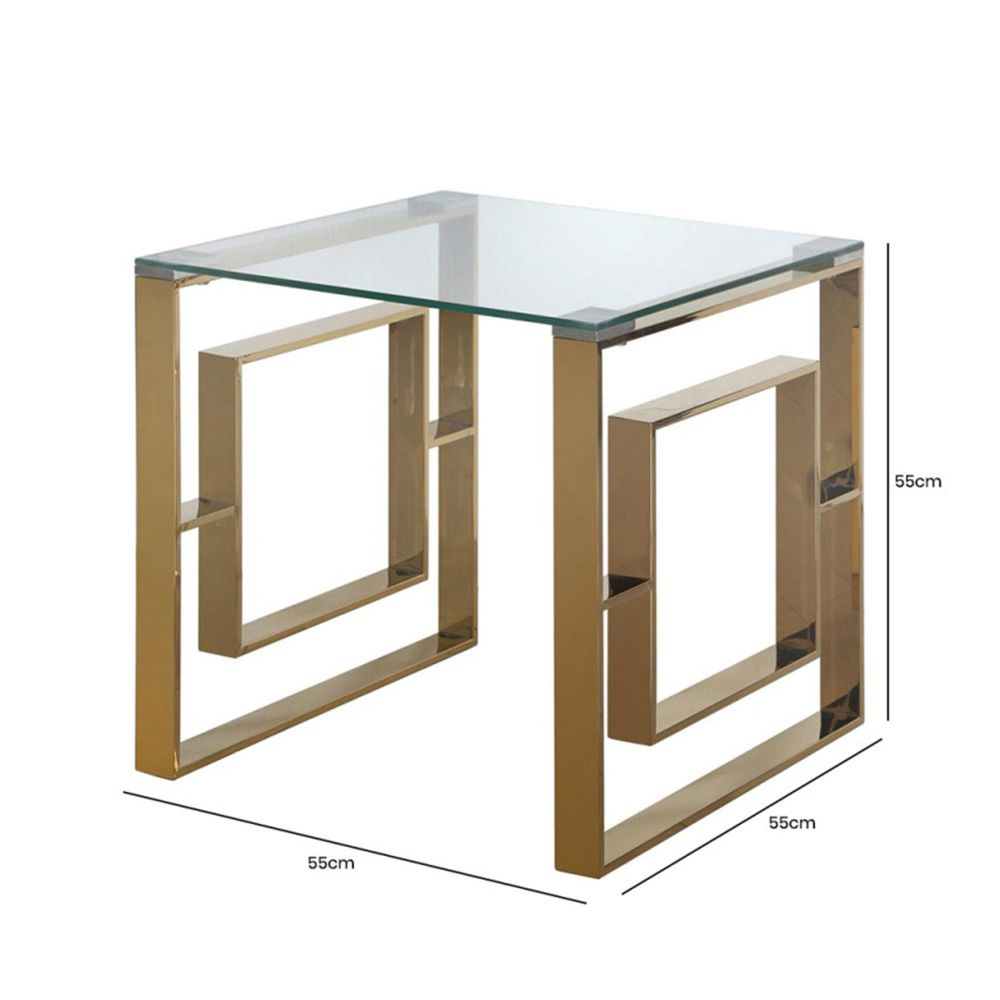 Item Code: MF125N-00-GLS-GD The simply stunning Apex end table will wonderfully complement classic and modern furniture, with its understated and stylish steel gold effect frame. The glass end table features a sleek glass tabletop, providing perfect entertainment space and also a fantastic option for any style of living room. Also perfect as lamp/sofa/bedside/display/occasional tableFree Delivery