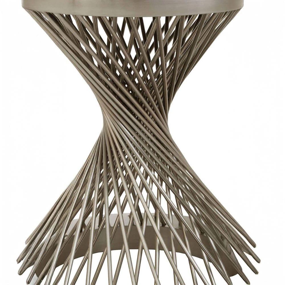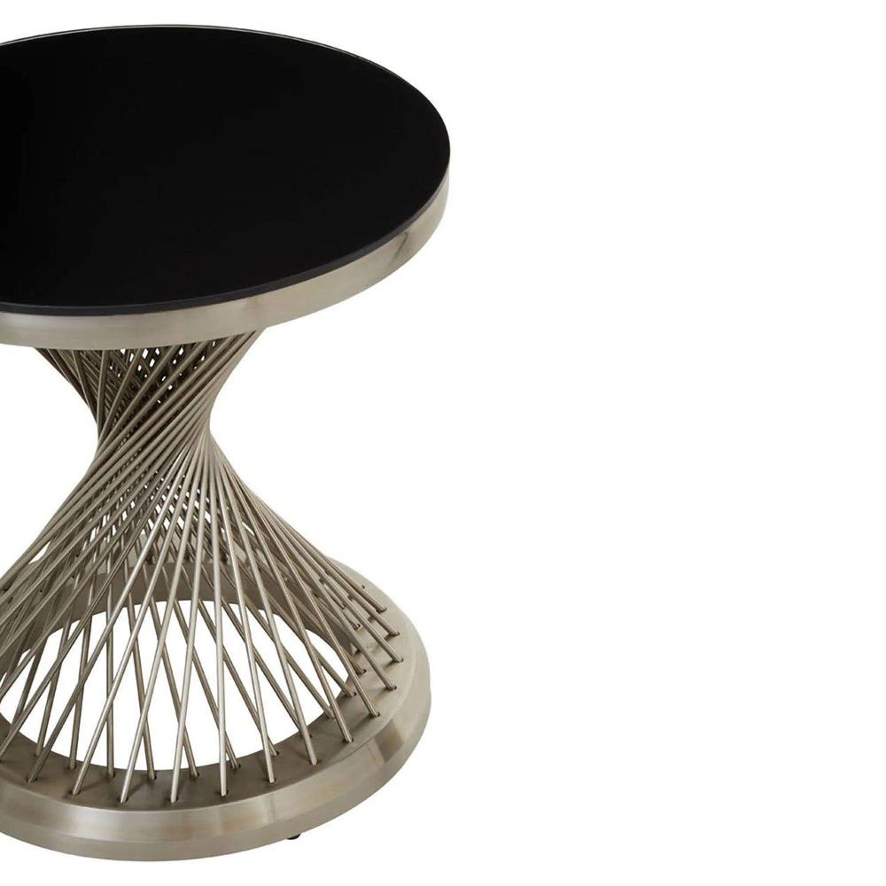 Item Code: 5527686 Featuring hourglass imagery with sleek lines and a round top, this side table will create a luxe accent to a wide range of decors.Topped with a circular black glass and silver finish base, this side table will lend character and depth to the interior. The geometric shape base is given a modern styling with the gold effect finish and a smooth black glass sits neatly on top of the frame.