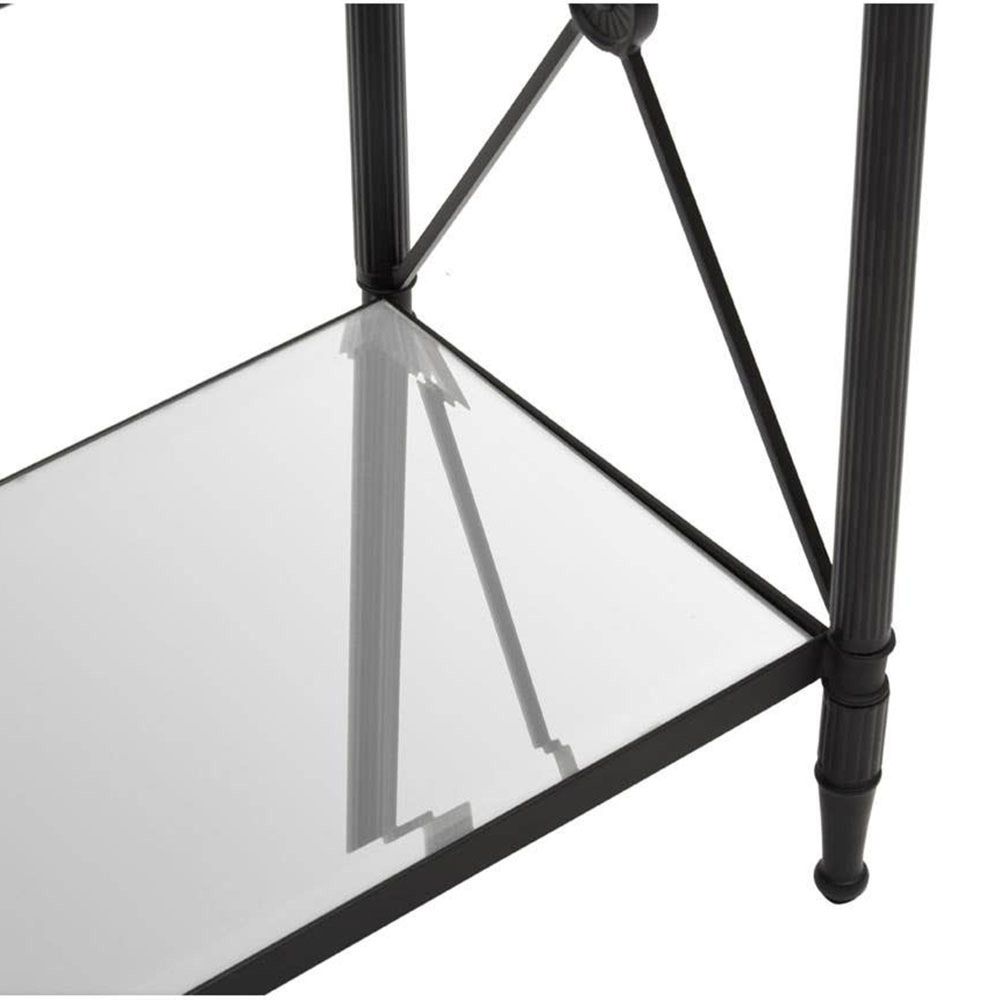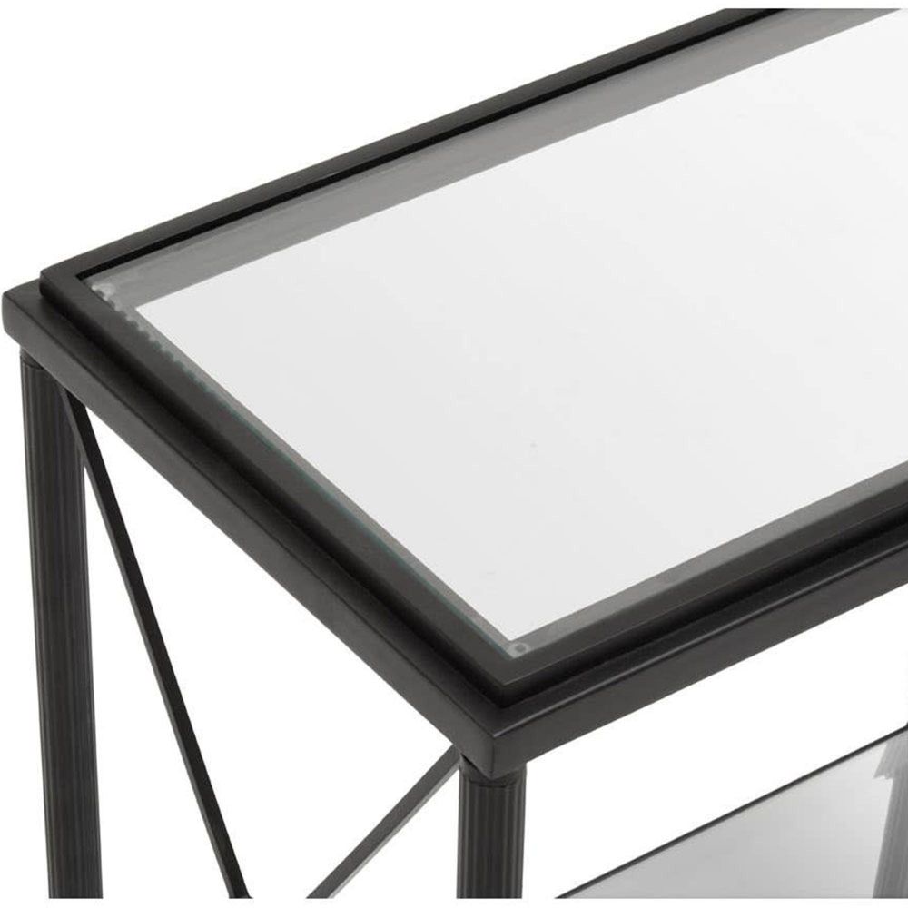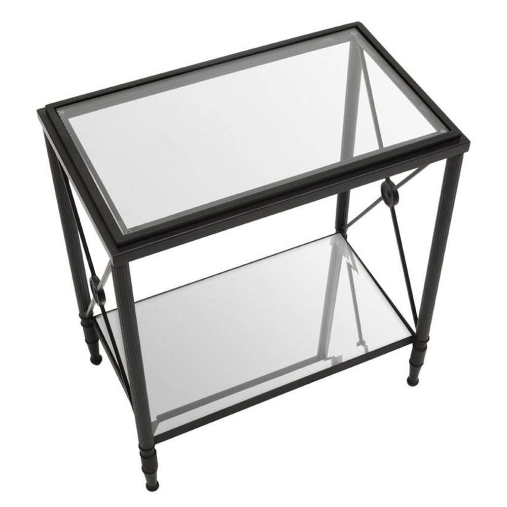 Item Code: 5528757 A mix of contemporary and classical design, this side table enhances architectural interest with x shaped sides. This side table has a rectangular metal frame in a black finish forming a monochrome contrast with the clear glass. Supporting two-tier glass levels, the frame features a cross design at each end which is connected with a floral motif.