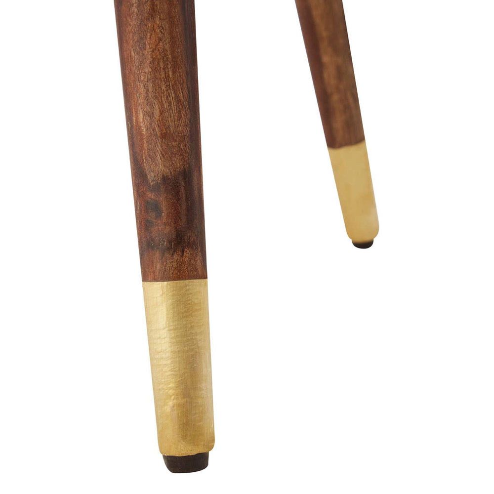 Item Code: 5501092 Exhibiting a classic profile, this side table is a functional yet decorative addition to vintage-inspired decors. This side table features a fusion of acacia wood and robust metal. Skilfully handcrafted, this side table emanates traditional elegance with embossed gold finish carving on a round top. The tripod base is supported by ferrule to add an industrial appeal.