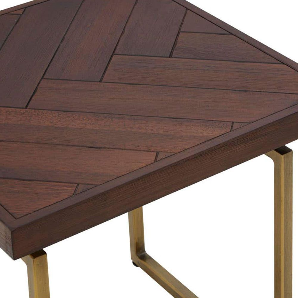 Item Code: 2405037 The Brando side table is a visually captivating combination of acacia wood veneer and antique brass. This side table has a minimalist profile having a sleek acacia wood veneer top and a herringbone engraving on it. The frame of the table comes in an antique brass finish that complements the dark tone of acacia wood veneer.