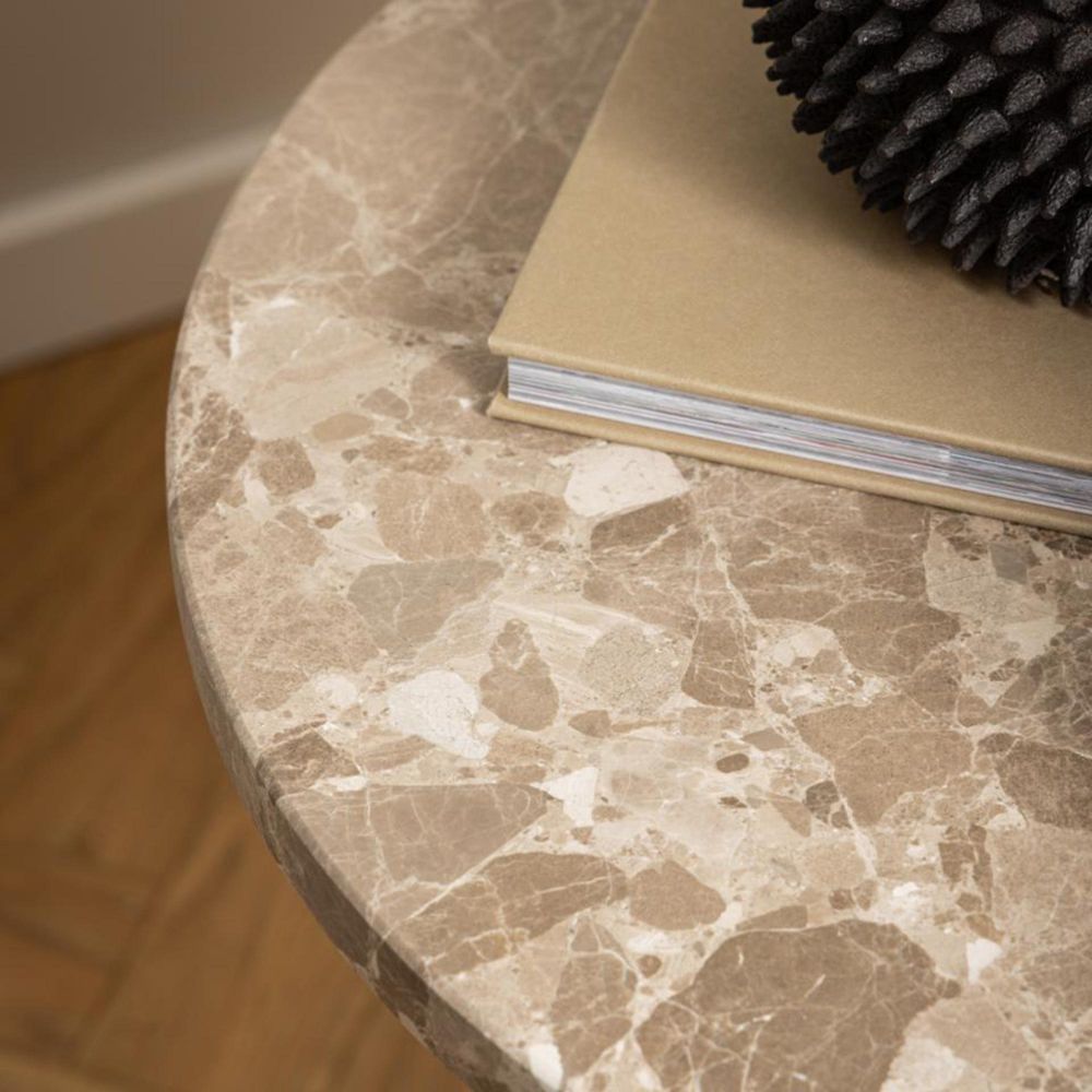 Item Code: H000023616 Naxos round side table, top and pillar base matt Latte brown lacquered marble. This side table's clean lines and geometric form add drama and sophistication to the interior. Each table is unique due to the stone's natural variations in colour, surface, and structure. Besides flattering the round tabletop, the hexagonal pillar base provides a sturdy foundation, while highlighting the raw beauty of the material.Free Delivery