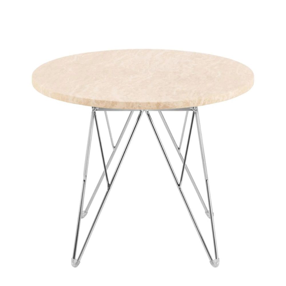 Item Code: H000023719 Prunus round side table, top matt beige lacquered travertine, wire base chrome steel. This side table will appeal to both minimalists and maximalists alike. It boasts a visually striking travertine top that is supported by a chromed wire base. The balanced contrast between proportions lends a light-hearted charm to the design. It easily adapts to all kinds of interior styles.Free Delivery