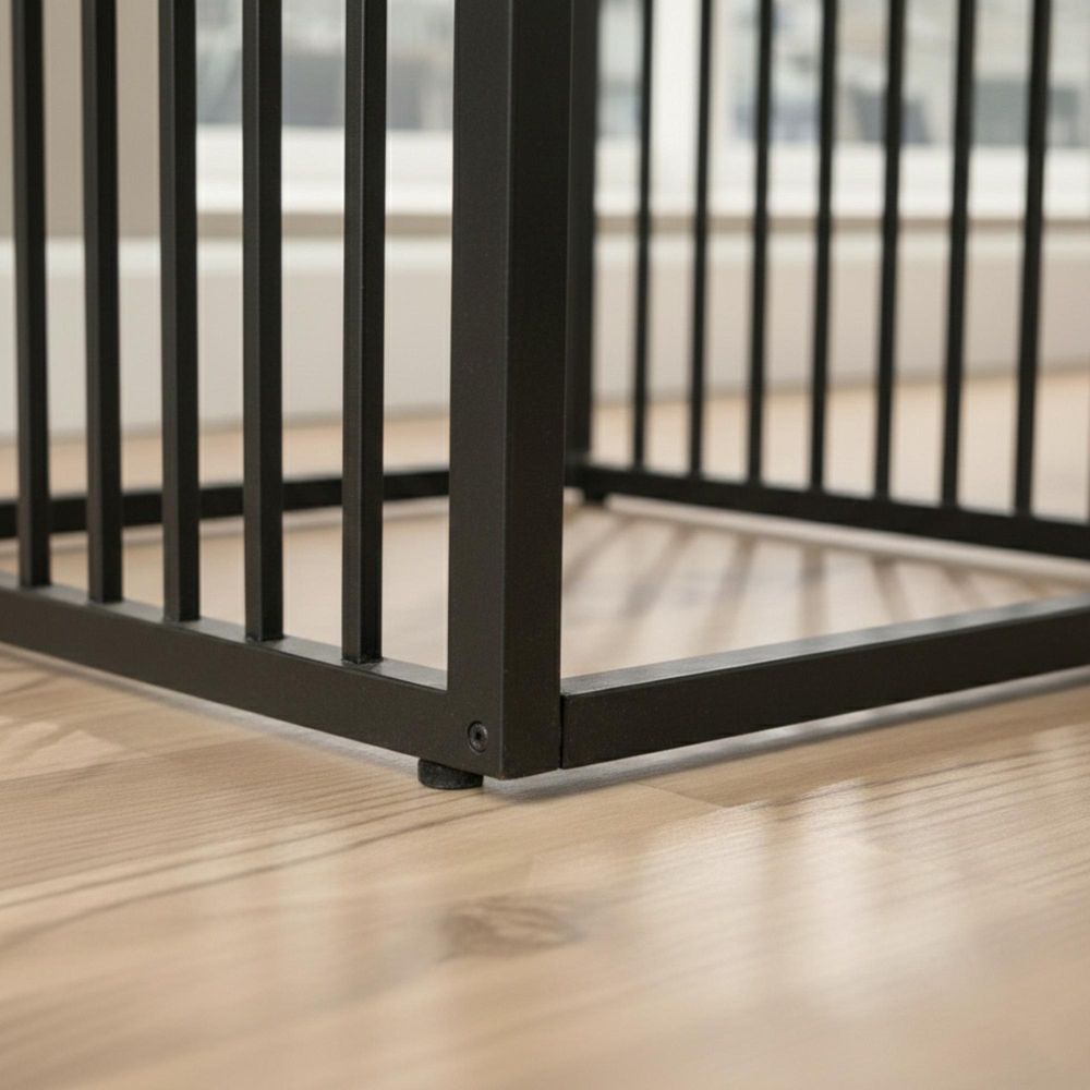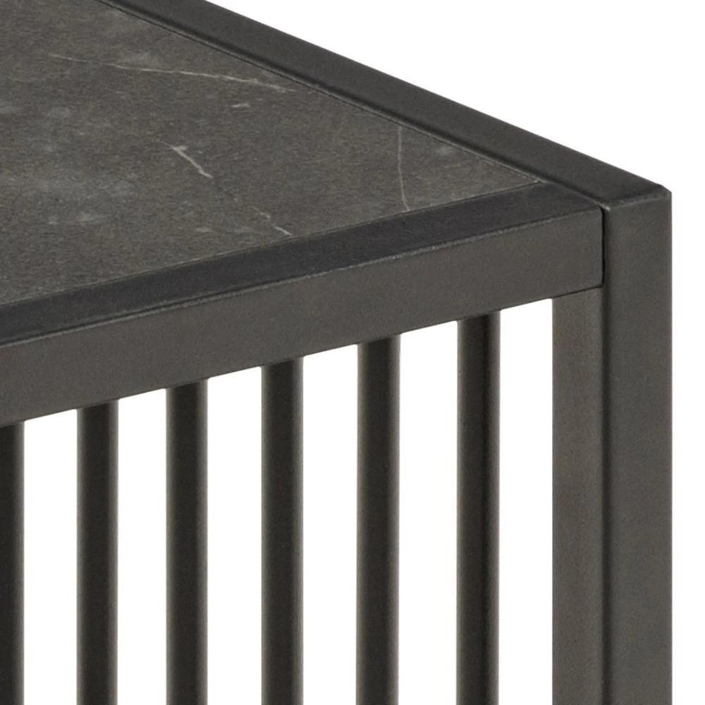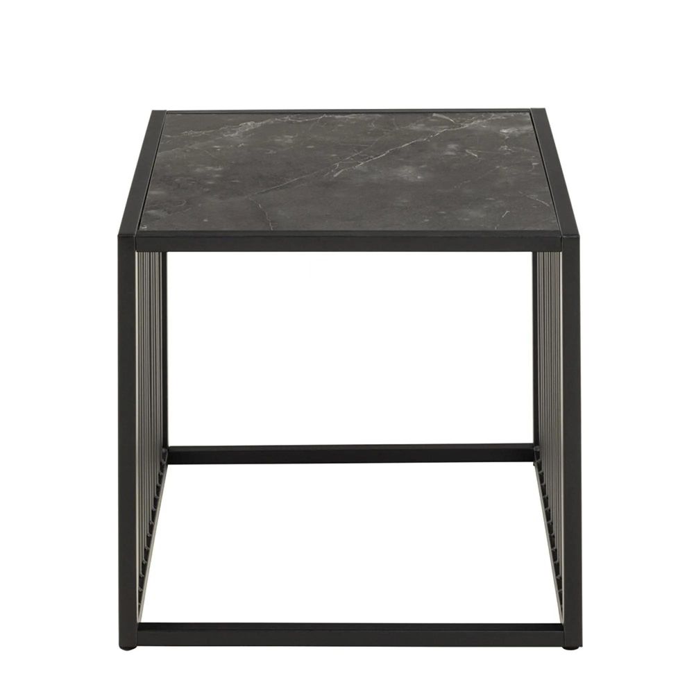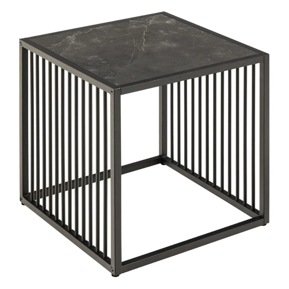 Item Code: 98881 Strington square side table, top matt black Izmir rough melamine, wire base matt black rough powder coated steel. Who would have thought a side table could be this cool. Such design easily makes a statement in any modern home. The black metal frame comes with vertical metal slats on 2 sides, while the tabletop charms you with the black marble look. Style the table with your favourite vase or plant to make it personal.Free Delivery