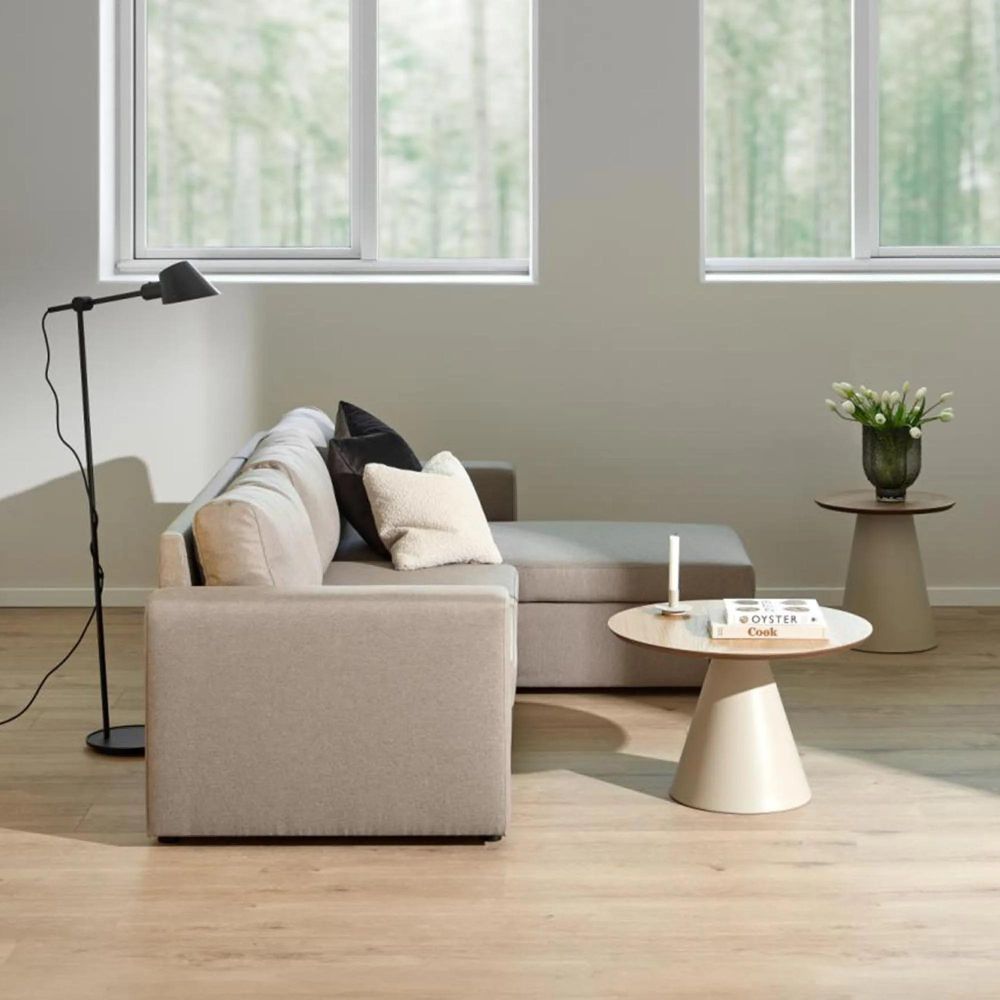 Item Code: H000024072 Soli round Side table, top matt oak PU lacquered veneer, pillar base grey rough powder coated steel. Creating a visual intrigue, this round Side table will elevate the sofa area with its subtle expression. The design marries industrial and natural elements evoking a sense of balance and harmony. The conical pillar base, made of grey steel, appears softer to the eye when paired with a round top finished in a lacquered oak veneer.Free Delivery