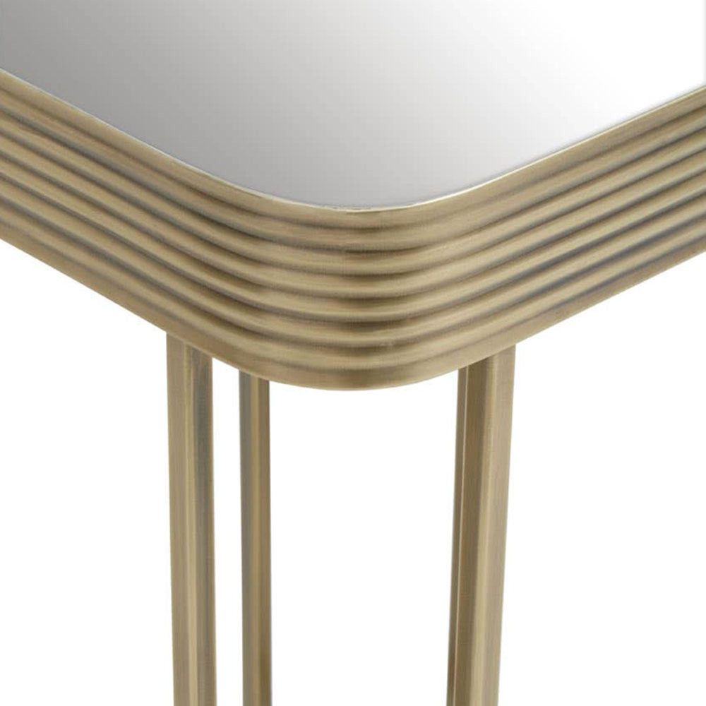 Item Code: 5528763 This Ella accent side table will elevate the modern home decor with its clean and simple design.This contemporary side table creates an elegant look with a series of gold finish lines forming its frame. A mirrored glass sits atop the minimalist frame with a border in decorative texture that matches the open base. This modern side table will complement modern home decor.
