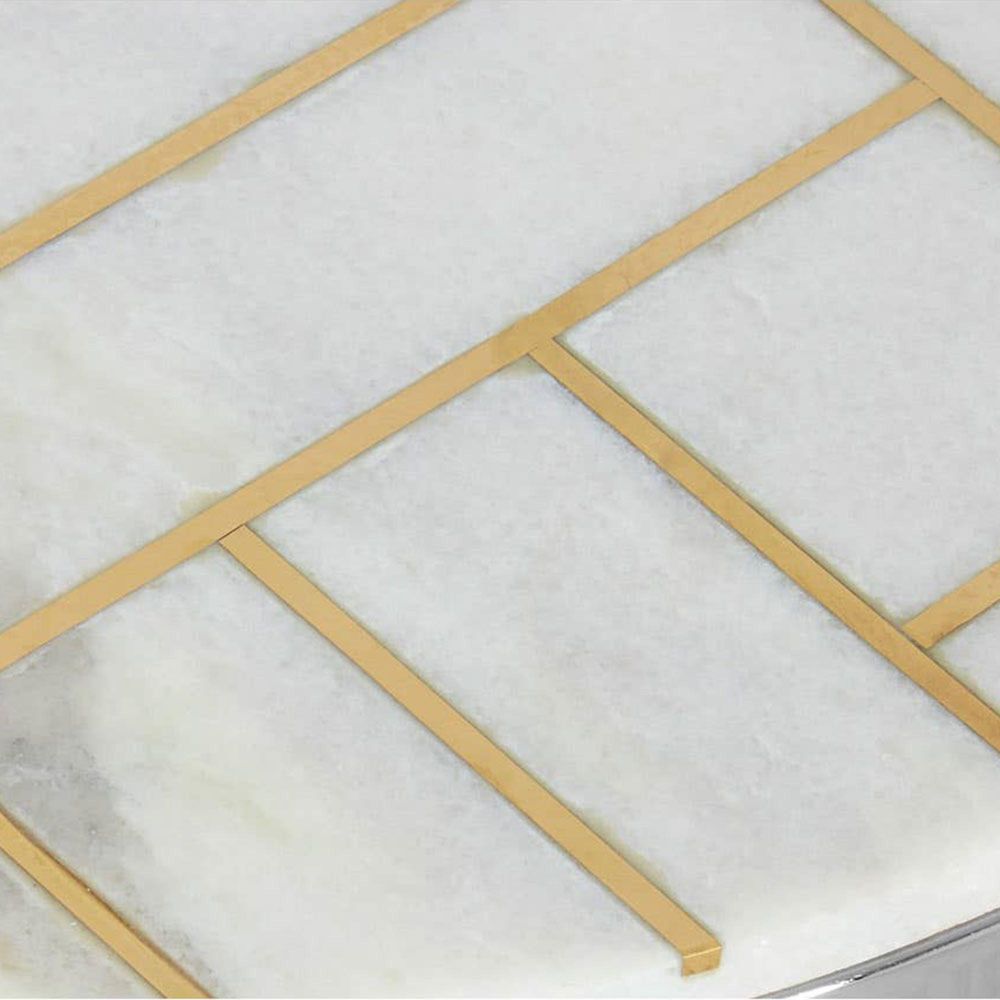 Item Code: 5502392 A round section of white marble creates the top of the luxe-style Eva side table.A distinctive geometric design embellishes the table's top, it's striking gold finish contrasting with the crisp white marble top. The table's art deco style frame counterpoints the warm metallic design with its cool silver finish.